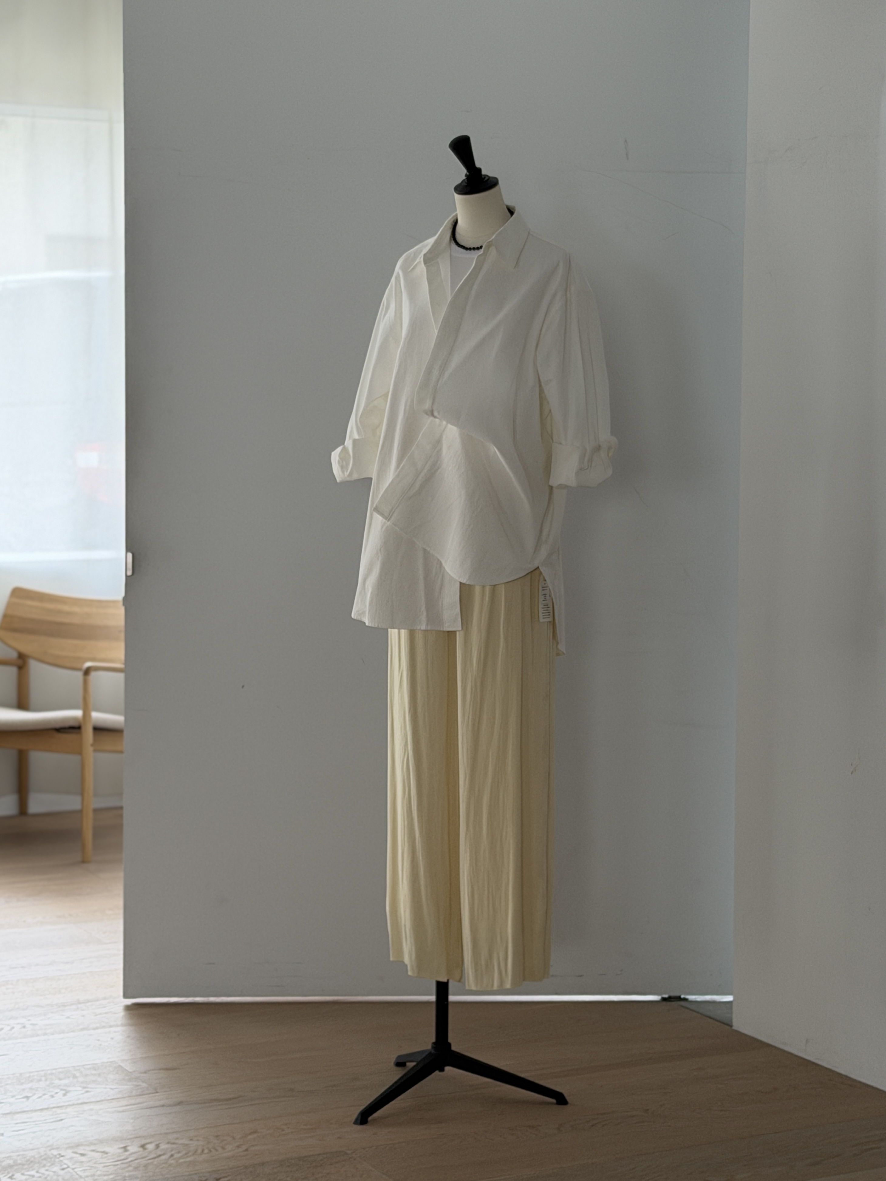 ボトムには、エアリーなサテン素材のワイドパンツを。ドレープのあるストレートシルエットが動きに合わせて柔らかく揺れ、全体に軽やかな印象を与えます。シャツのラフさとサテンの揺れ感、異なる素材を重ねることで、リラックス感のある春のレイヤードスタイルに仕上げています。