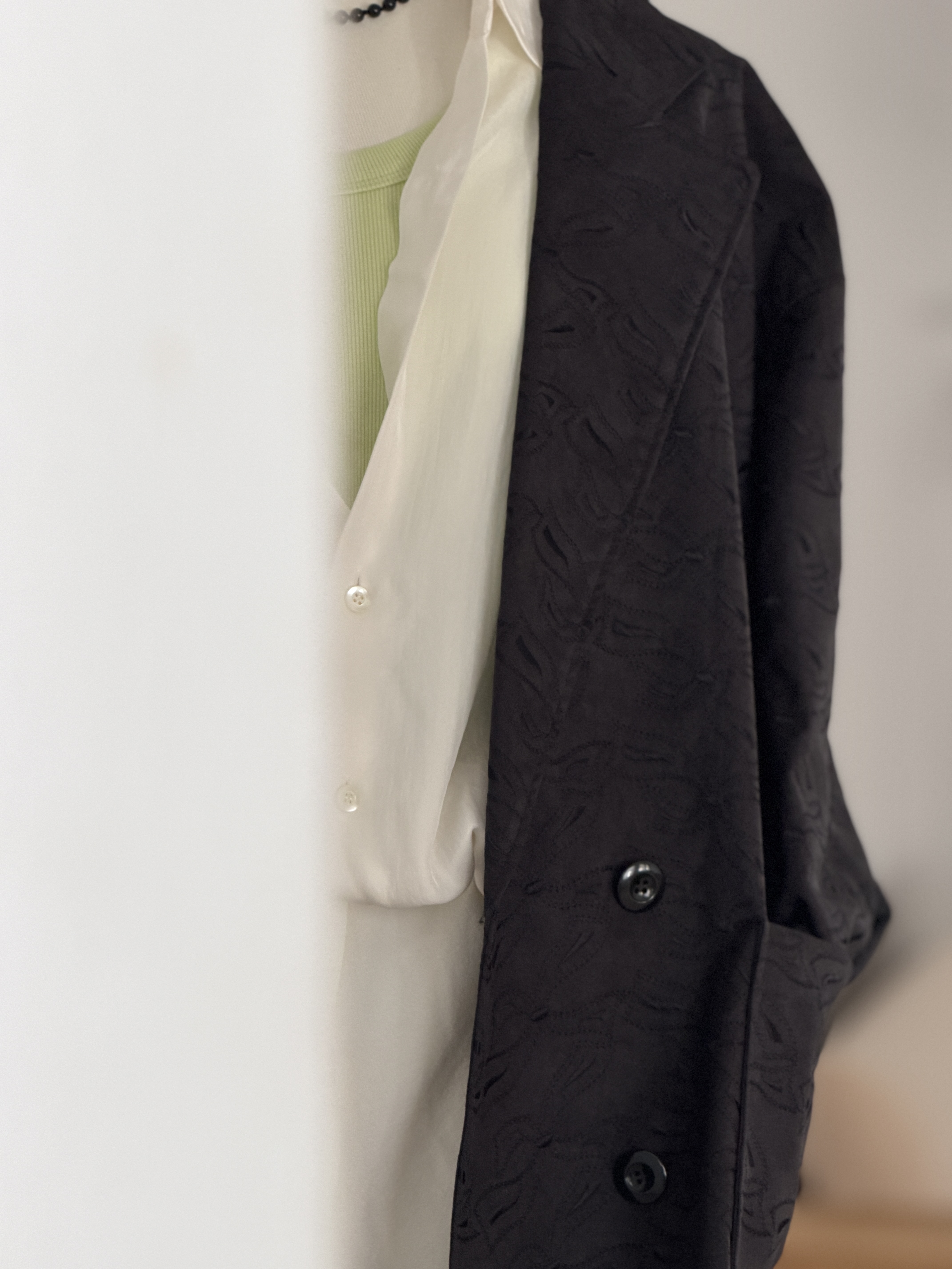 インナーには、ドレープの美しいツイルシャツを合わせて。アセテートのブライト糸の控えめな光沢とナチュラルなシワ感が、ジャケットの素材感と柔らかく調和します。ボタンを少し開け、インナーを覗かせることでヘルシーな抜け感をプラス。