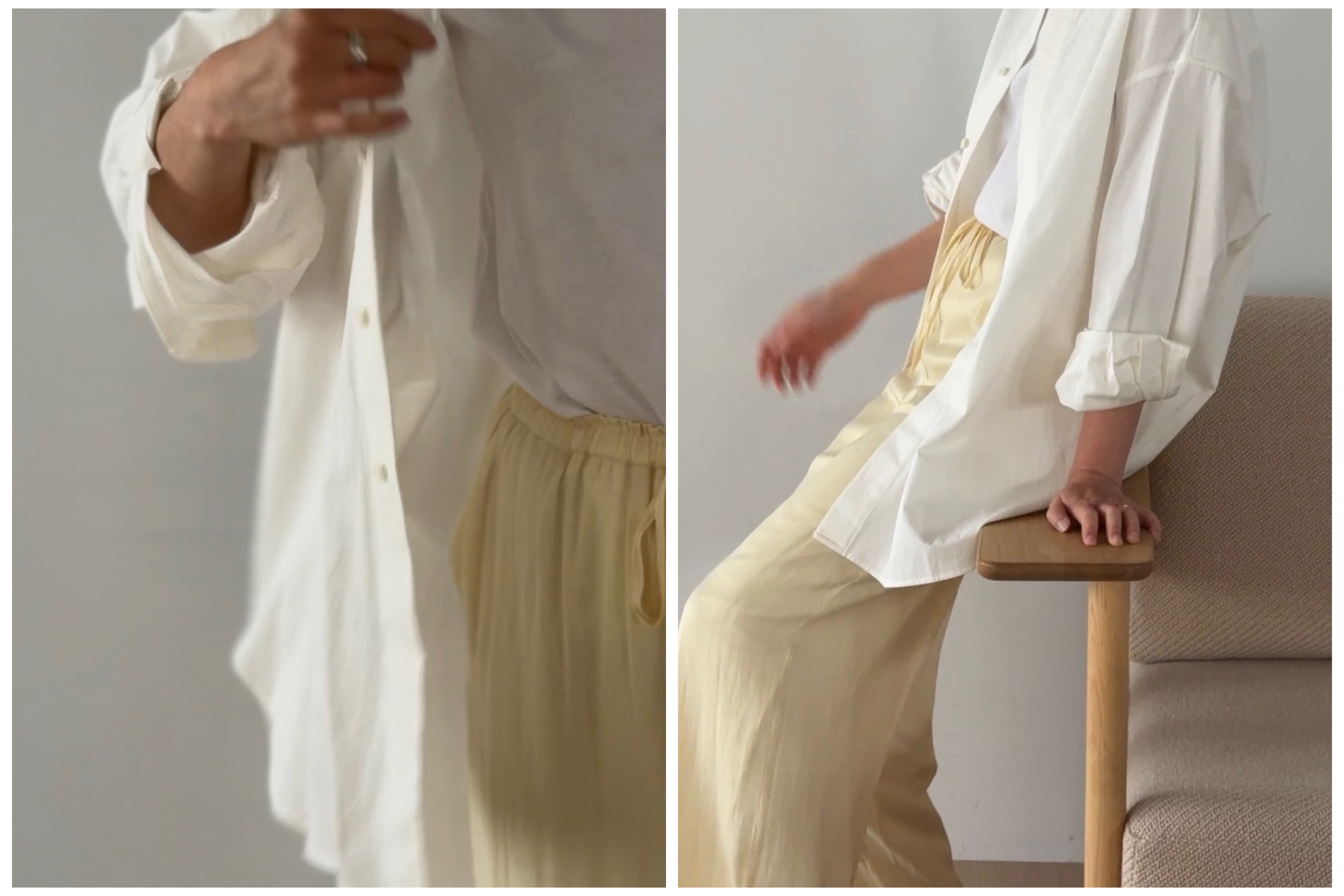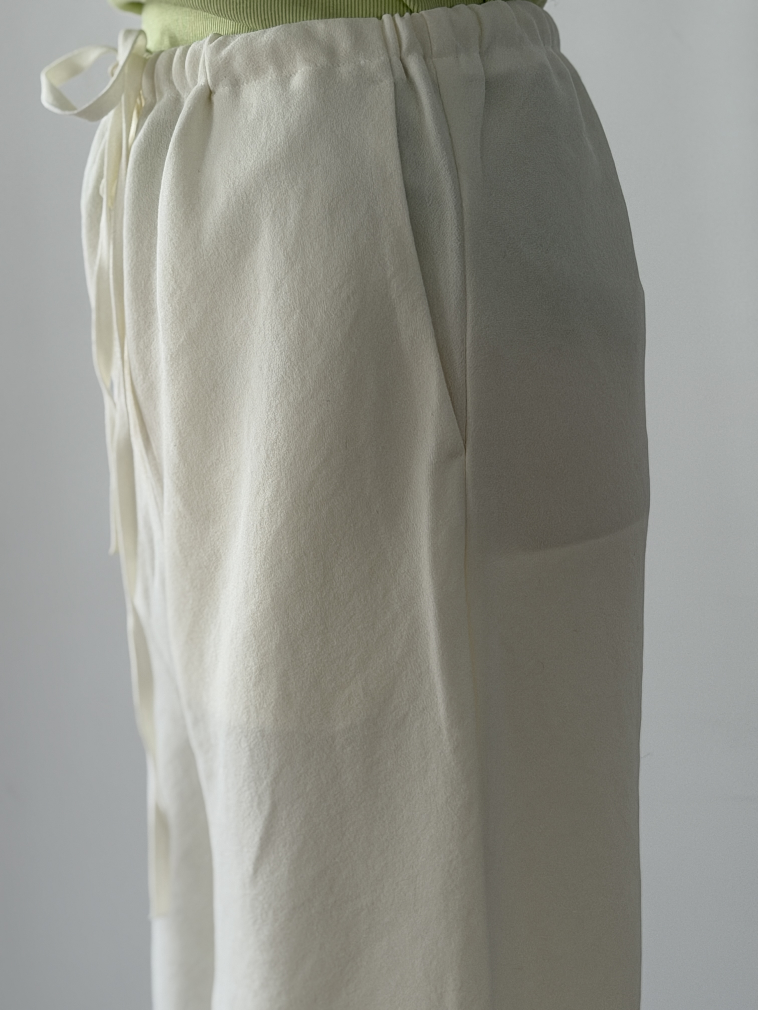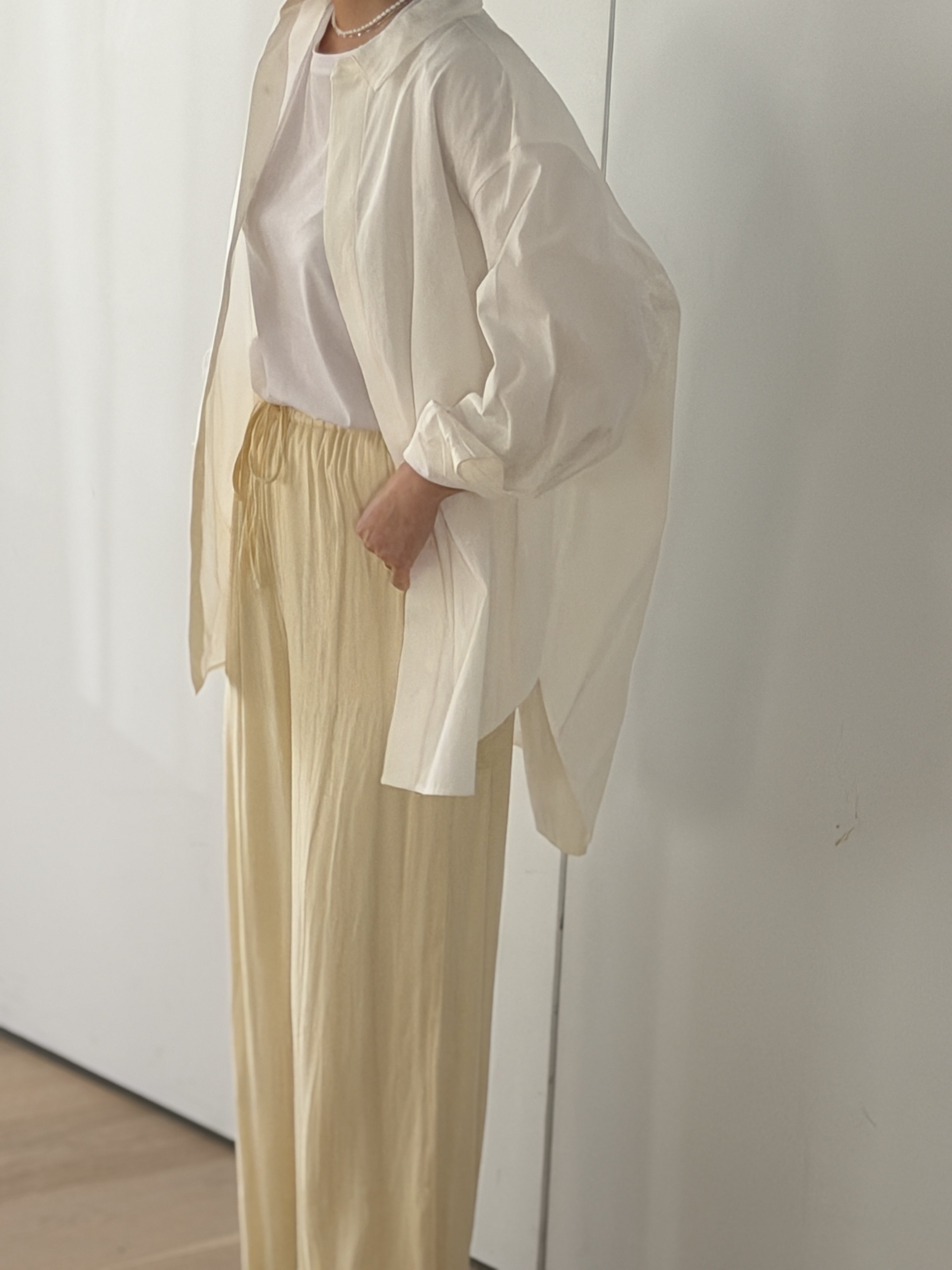 ボトムには、ジョーゼット素材のワイドパンツを。しなやかなドレープが全体のシルエットを美しく整え、異なる素材の重なりが奥行きを生みます。ゆったりとしたアイテム同士でも、素材の違いを活かすことで軽やかにまとまる春のレイヤードスタイルです。