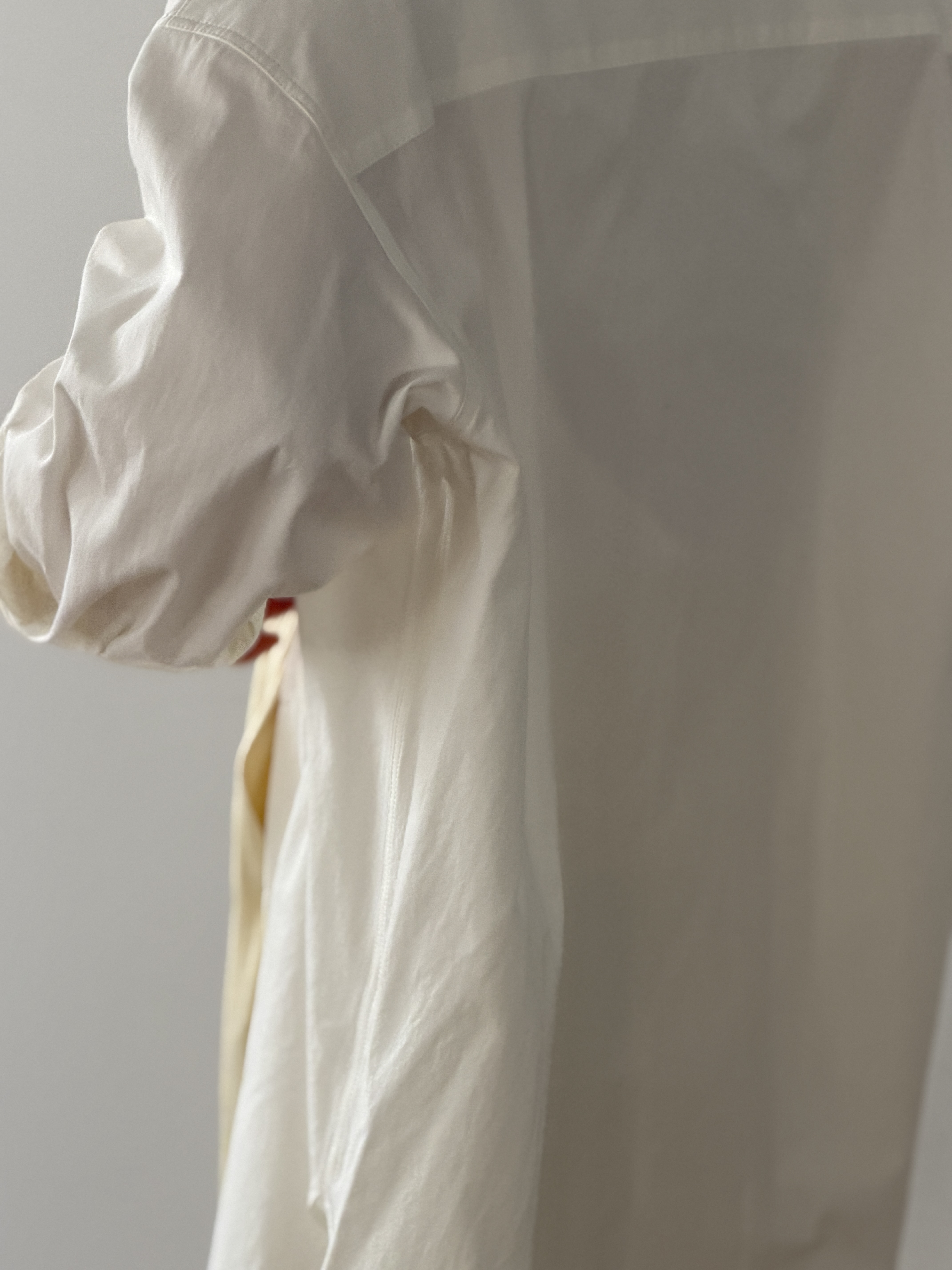 高級超長綿のしっとりとした滑らかな質感と、自然な光沢を持つギャバジン素材が、シンプルなスタイリングにさりげない上質さを加えます。比翼仕立てのミニマルなデザインとゆとりのあるシルエットが、羽織るだけでほどよい抜け感を生み出します。