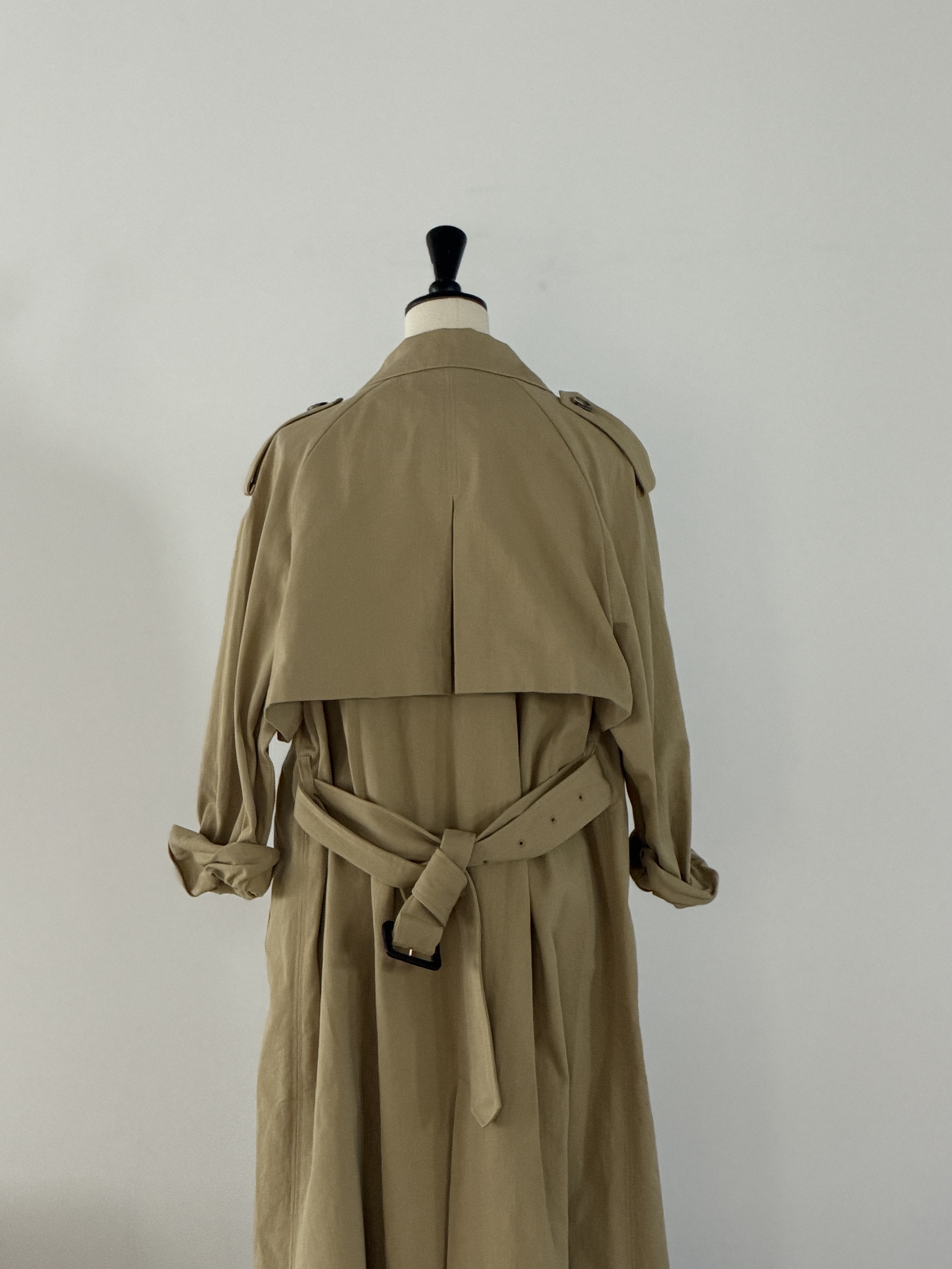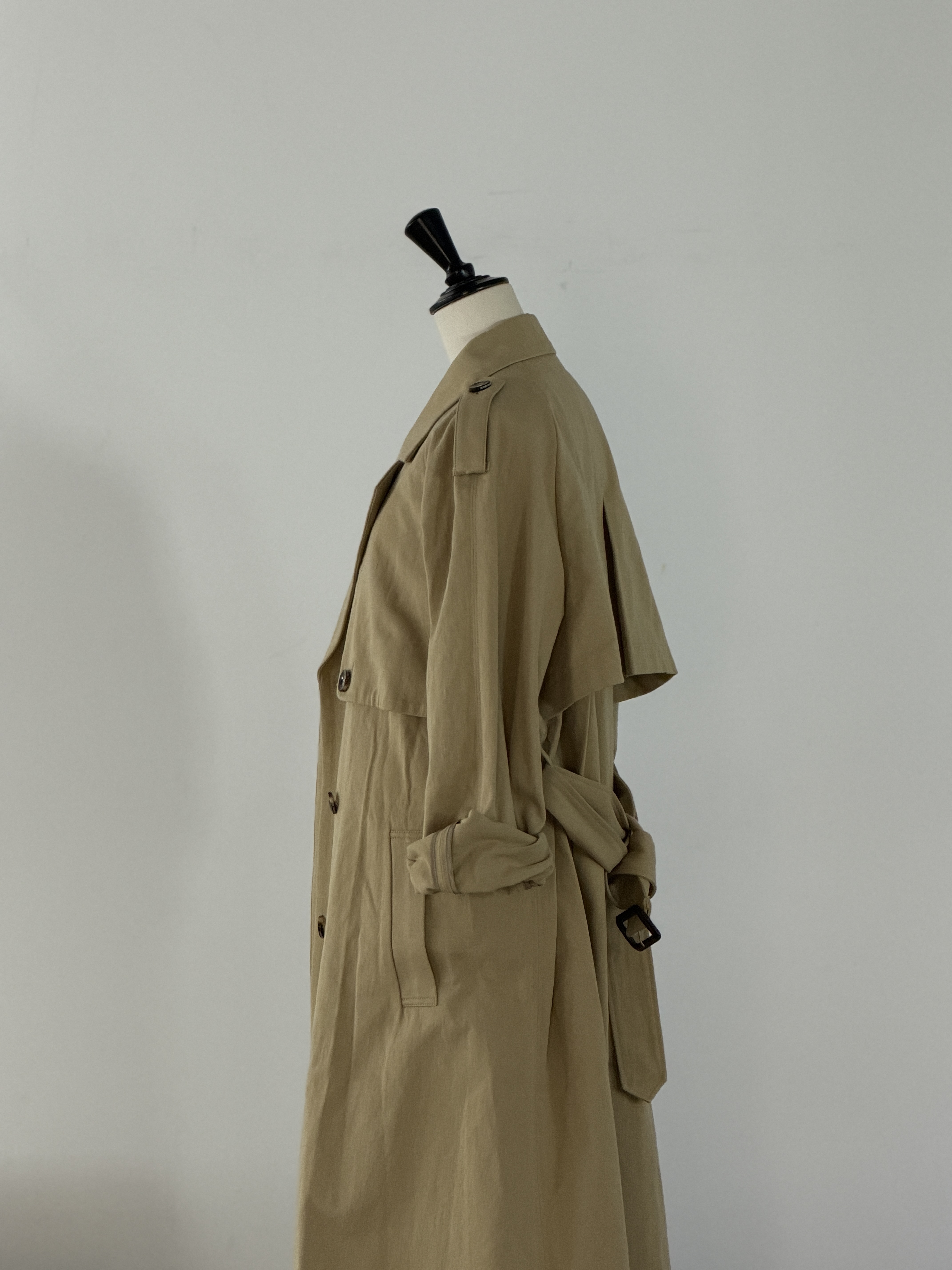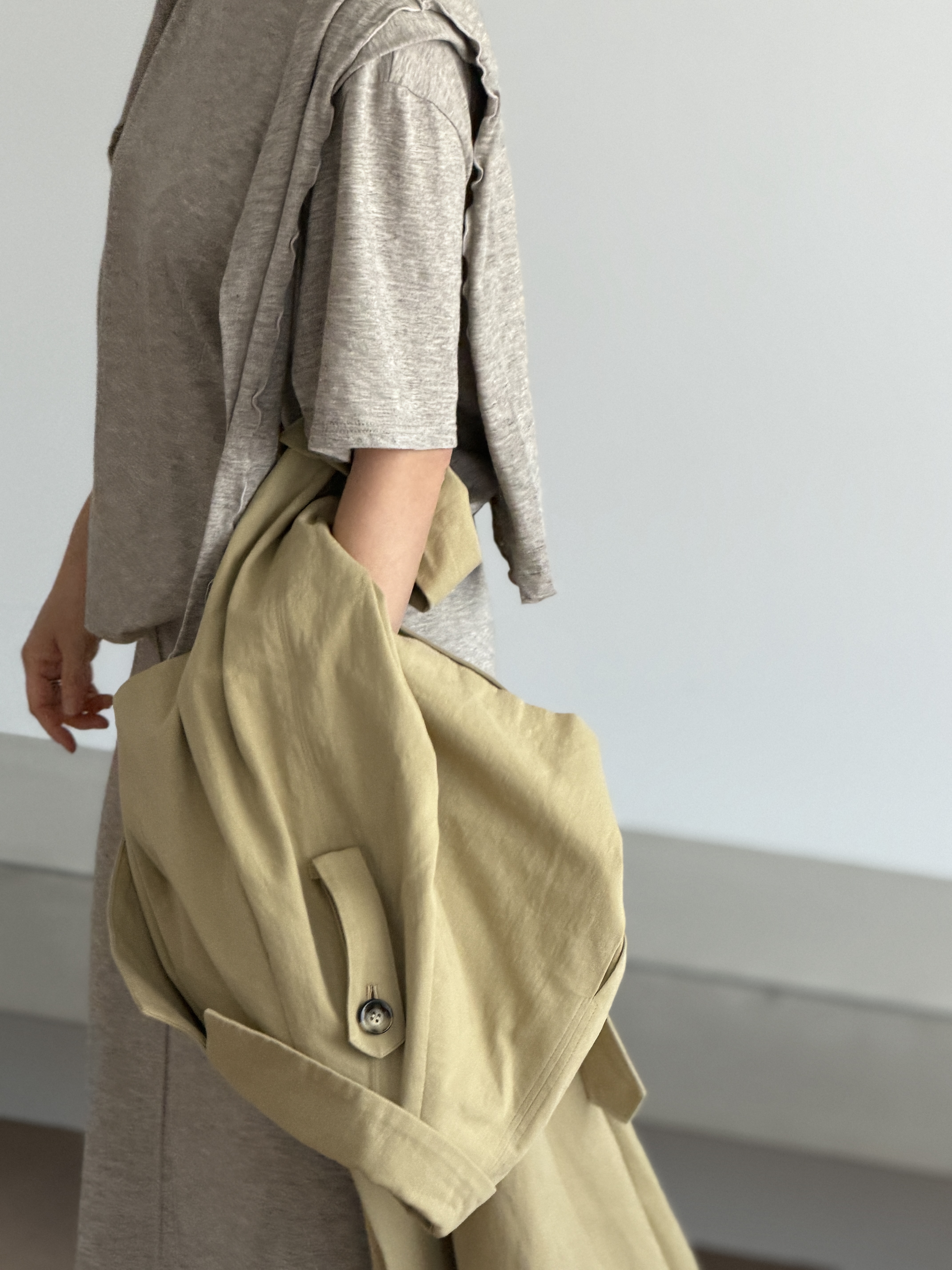 上質なディオラマツイル素材を使用したトレンチは、滑らかな肌触りと自然な光沢、ほどよいハリ感が特徴。クラシックなディテールをベースにしながら、オーバーサイズのシルエットが現代的な抜け感を生みます。袖を軽くまくり、前を開けて羽織ることで、コートの存在感を保ちながらも軽やかな印象に。