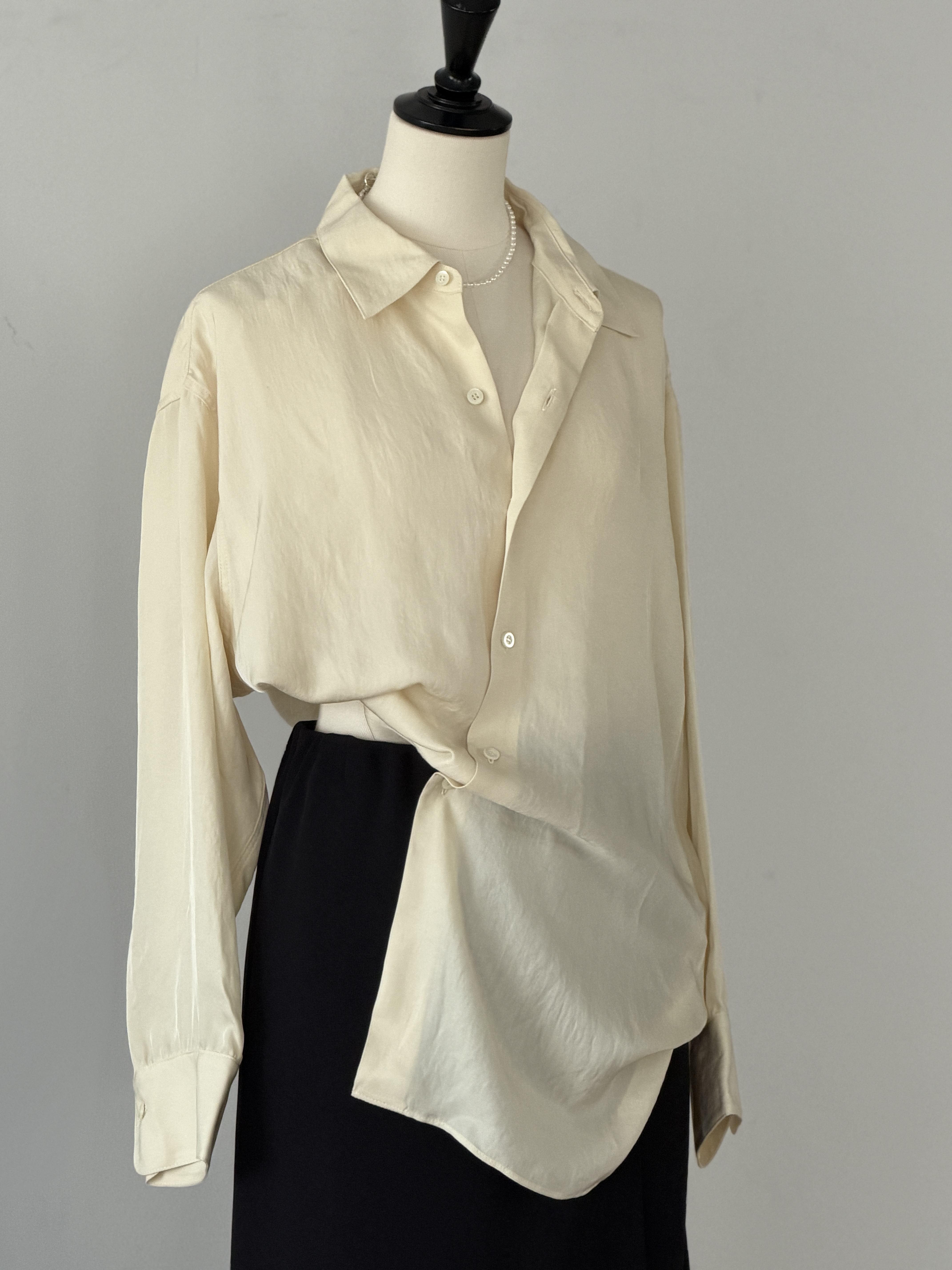 アセテート糸を甘撚りで織り上げたツイル素材は、美しいドレープと自然なシワ感が特徴。ビッグシルエットのメンズライクなデザインがほどよい抜けをつくります。