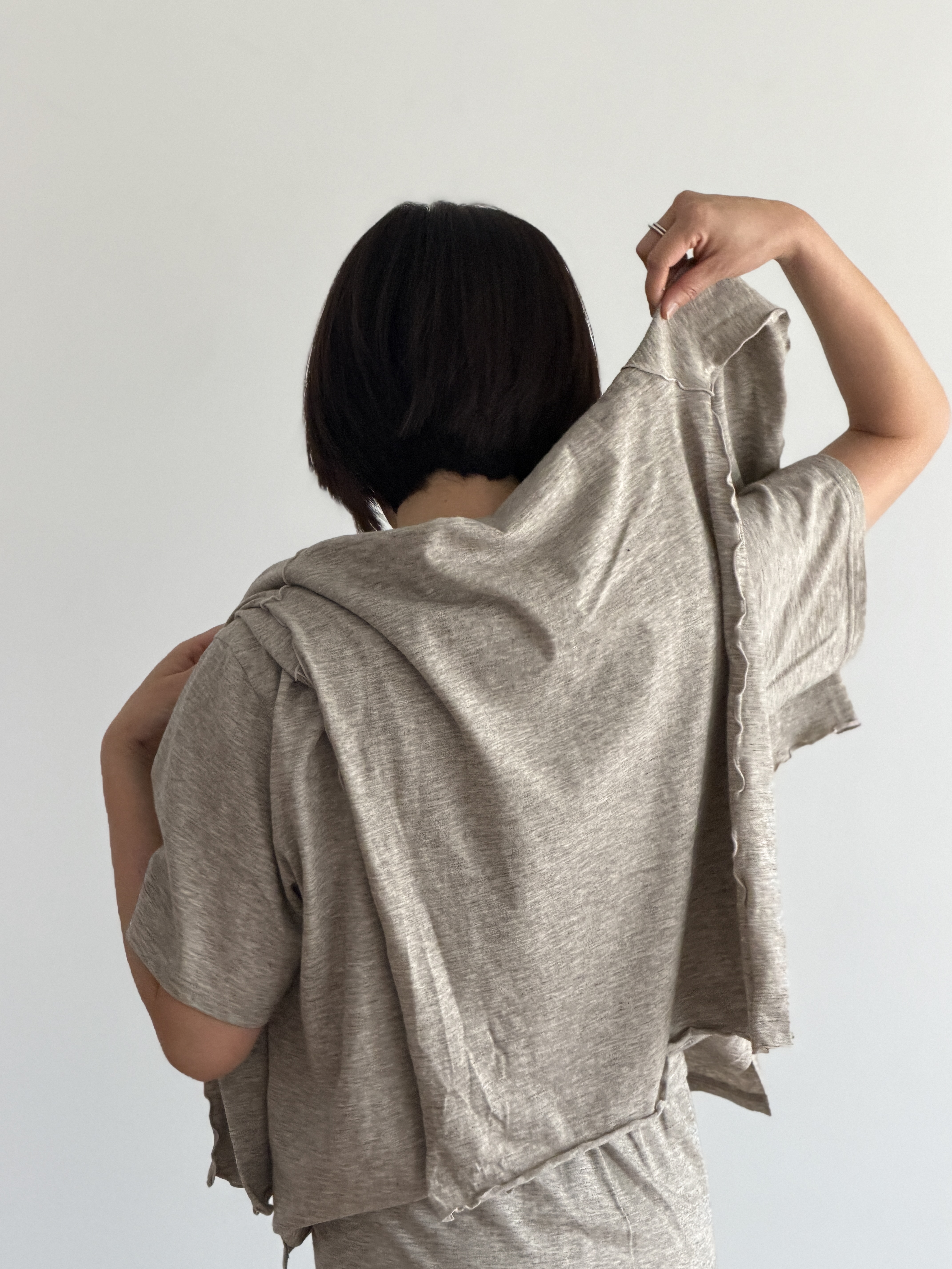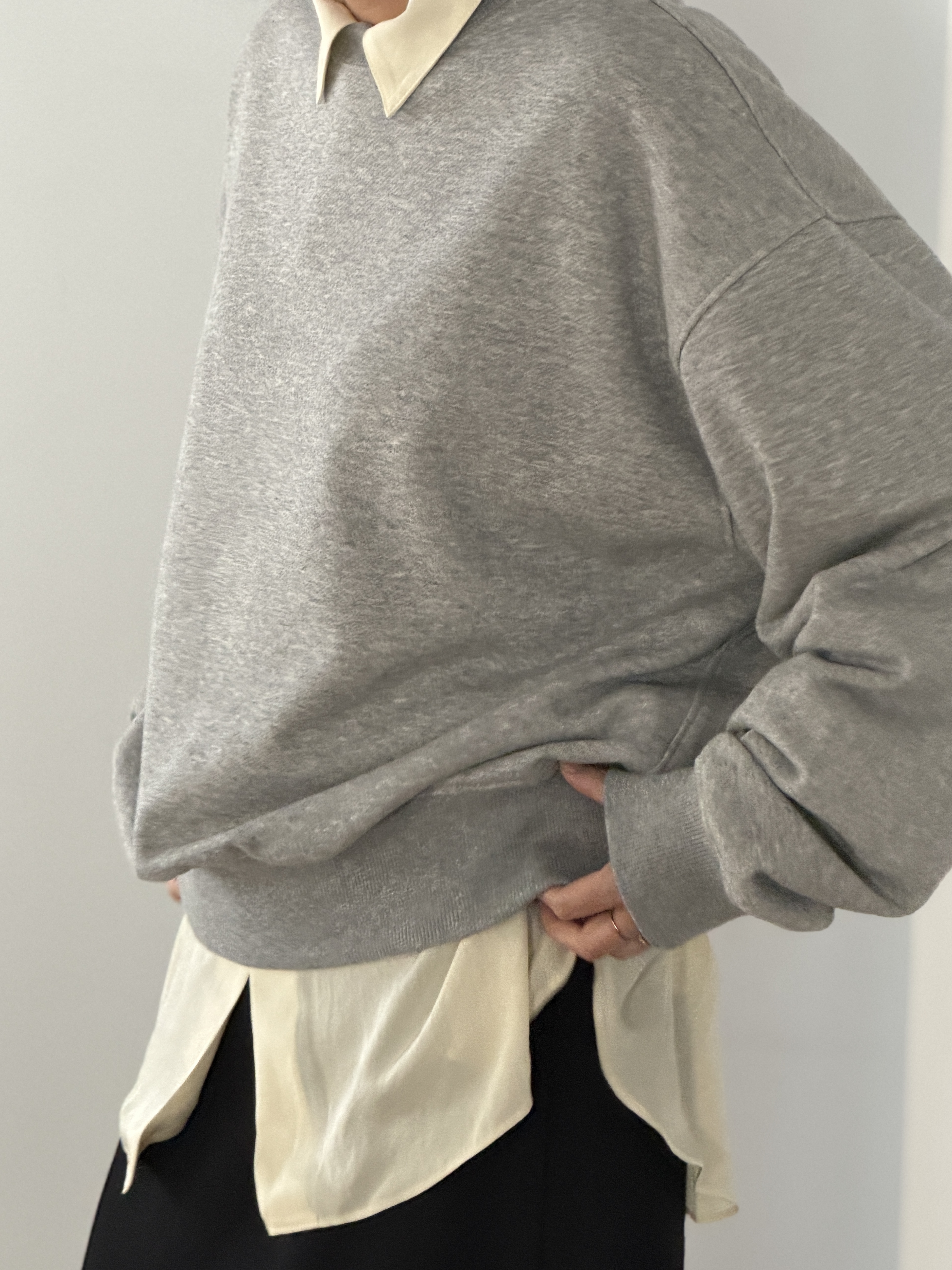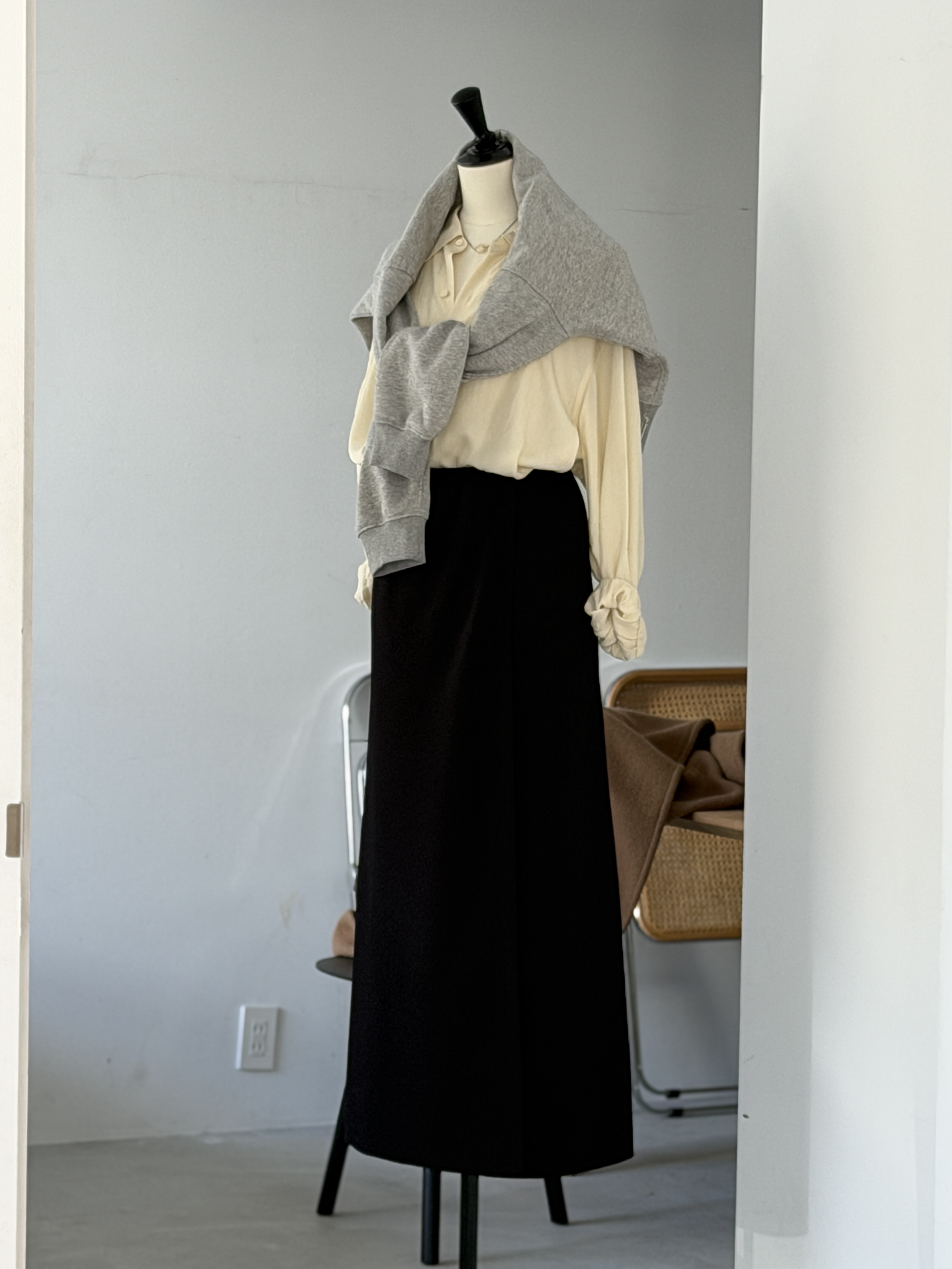その上から裏毛のスウェットを肩掛けに。肩に軽く掛けるだけで、きちんと感のあるシャツスタイルにリラックスしたニュアンスを添えます。ボトムには、ミニマルな巻きスカート型のロングスカートを合わせて。伸縮性のある2WAYストレッチ素材が、動くたびに揺れる裾の表情が、全体にさりげない軽さをもたらします。