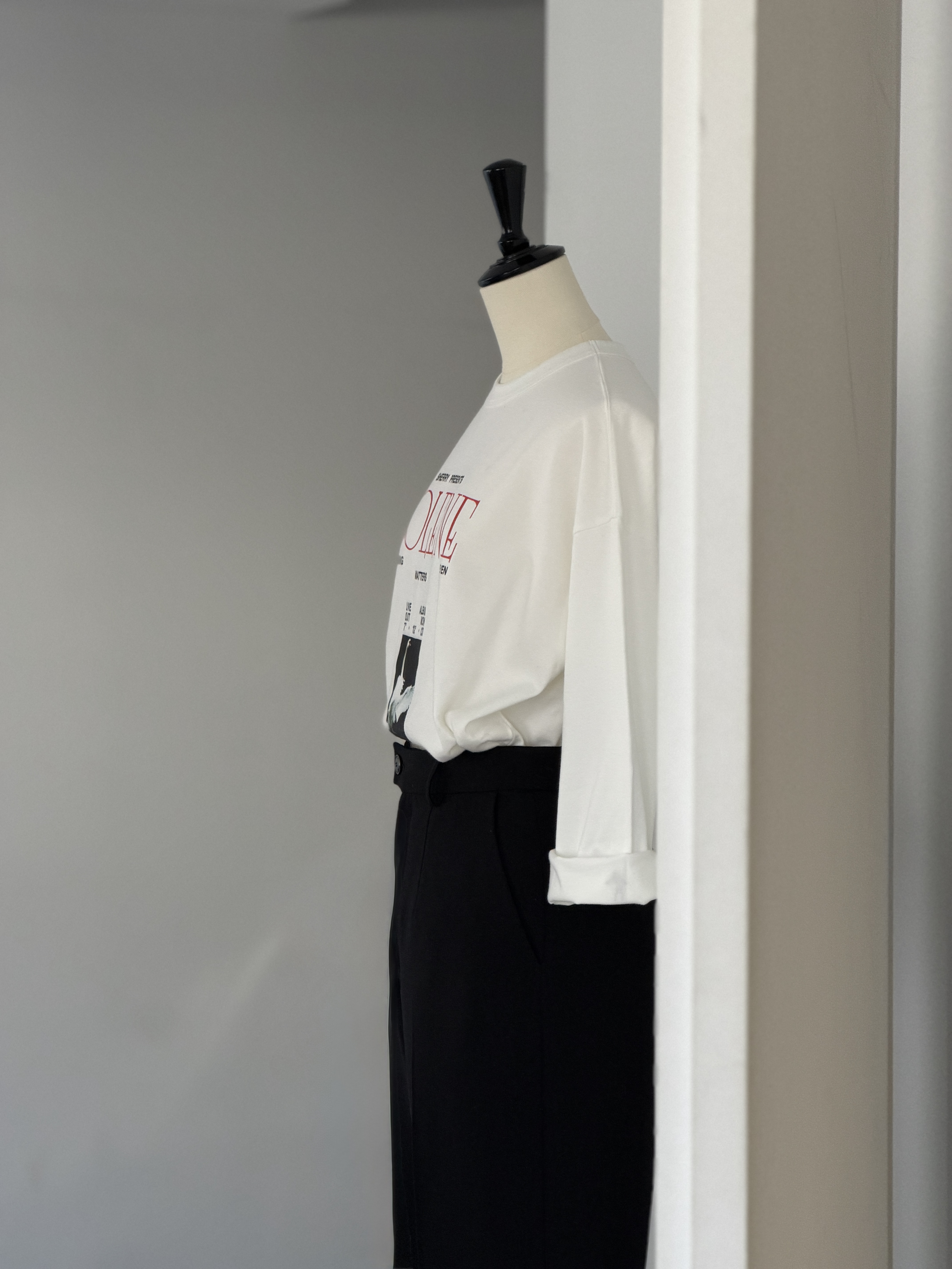 胸元に配したタイポグラフィと、静かなムードを漂わせるスワンのモチーフ。ややドロップショルダーに仕立てたビッグシルエットは、身幅にゆとりを持たせつつも、首元やデコルテは美しく見えるようパターンを調整し、カジュアルになりすぎない絶妙なバランスです。