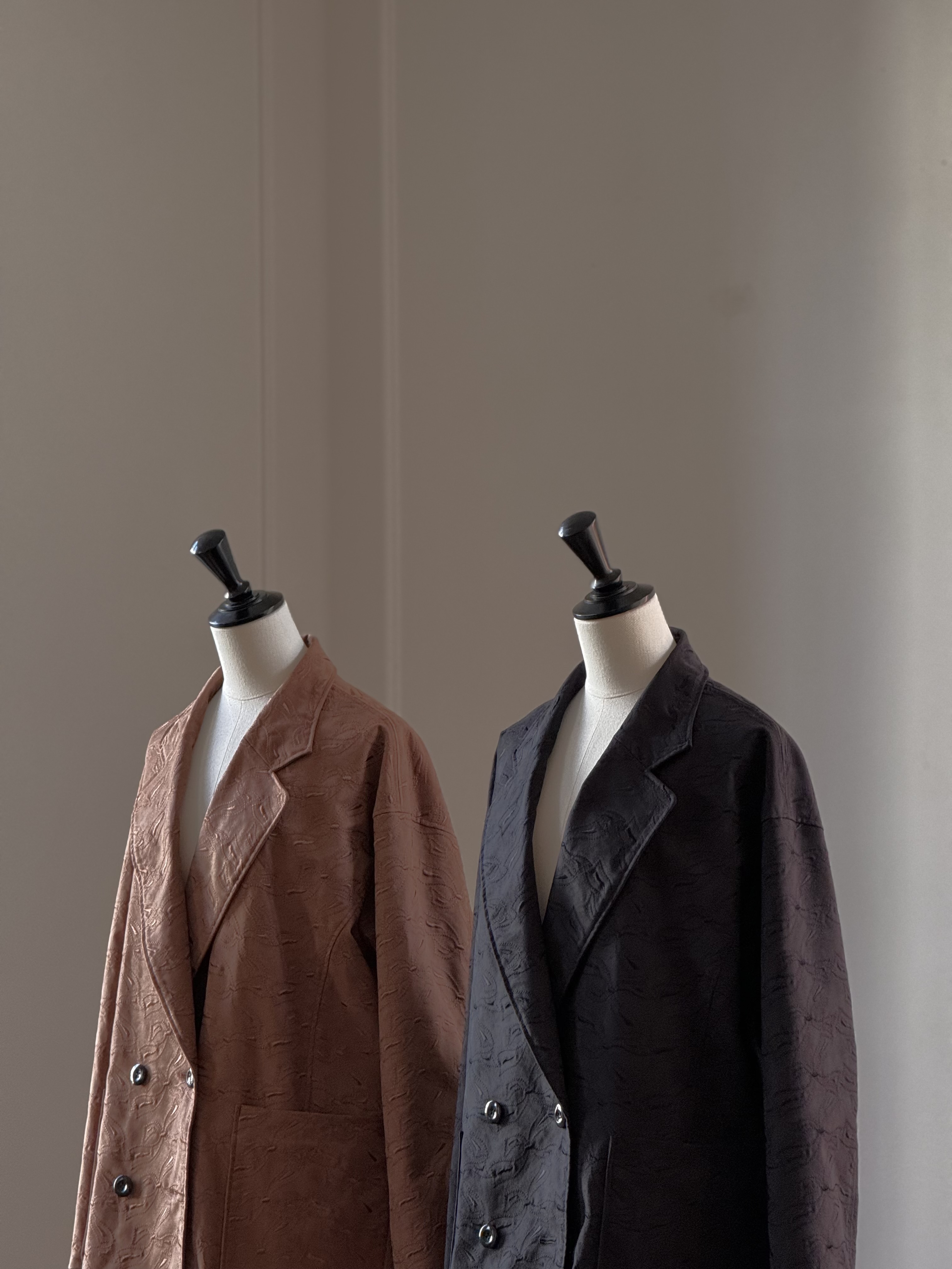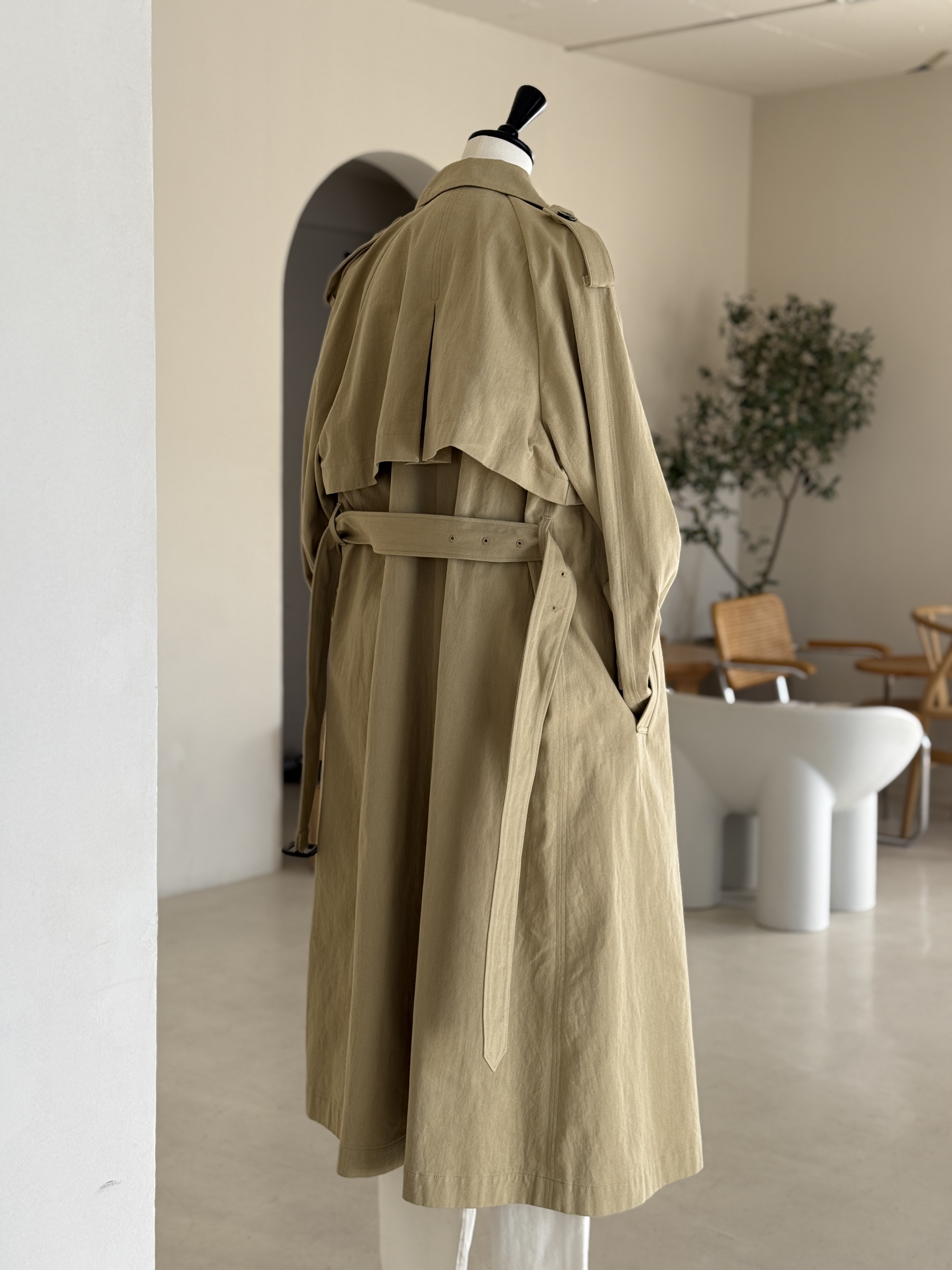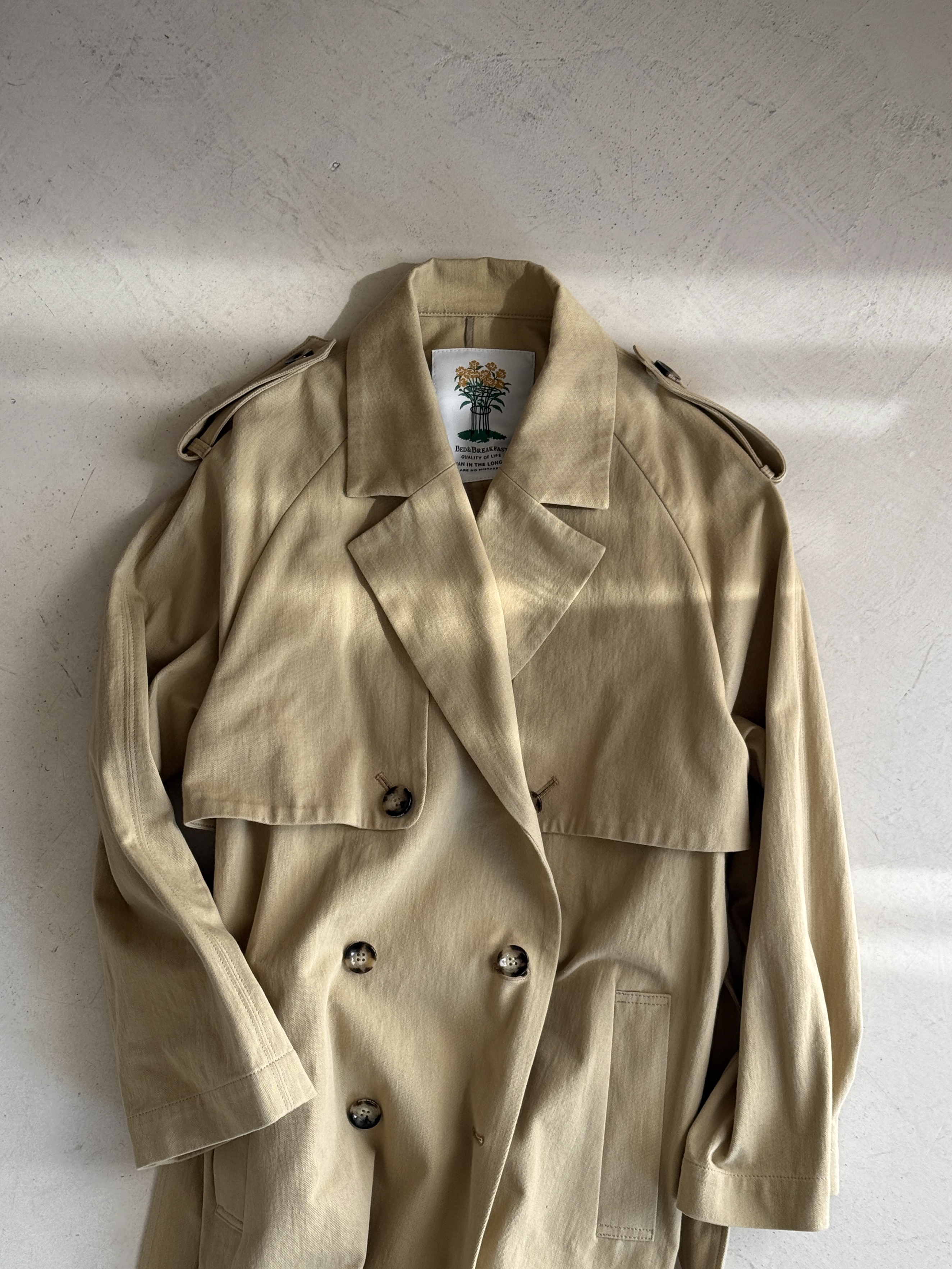〈BED&BREAKFAST〉のトレンチは、シルエットや素材感に変化をつけることで一層モダンな印象に。ベルトでウエストをマークすれば引き締まったスタイルに、ラフに羽織ればこなれた雰囲気に。柔らかさと構築感を兼ね備えたデザインが、日常の装いを洗練されたものへと導きます。