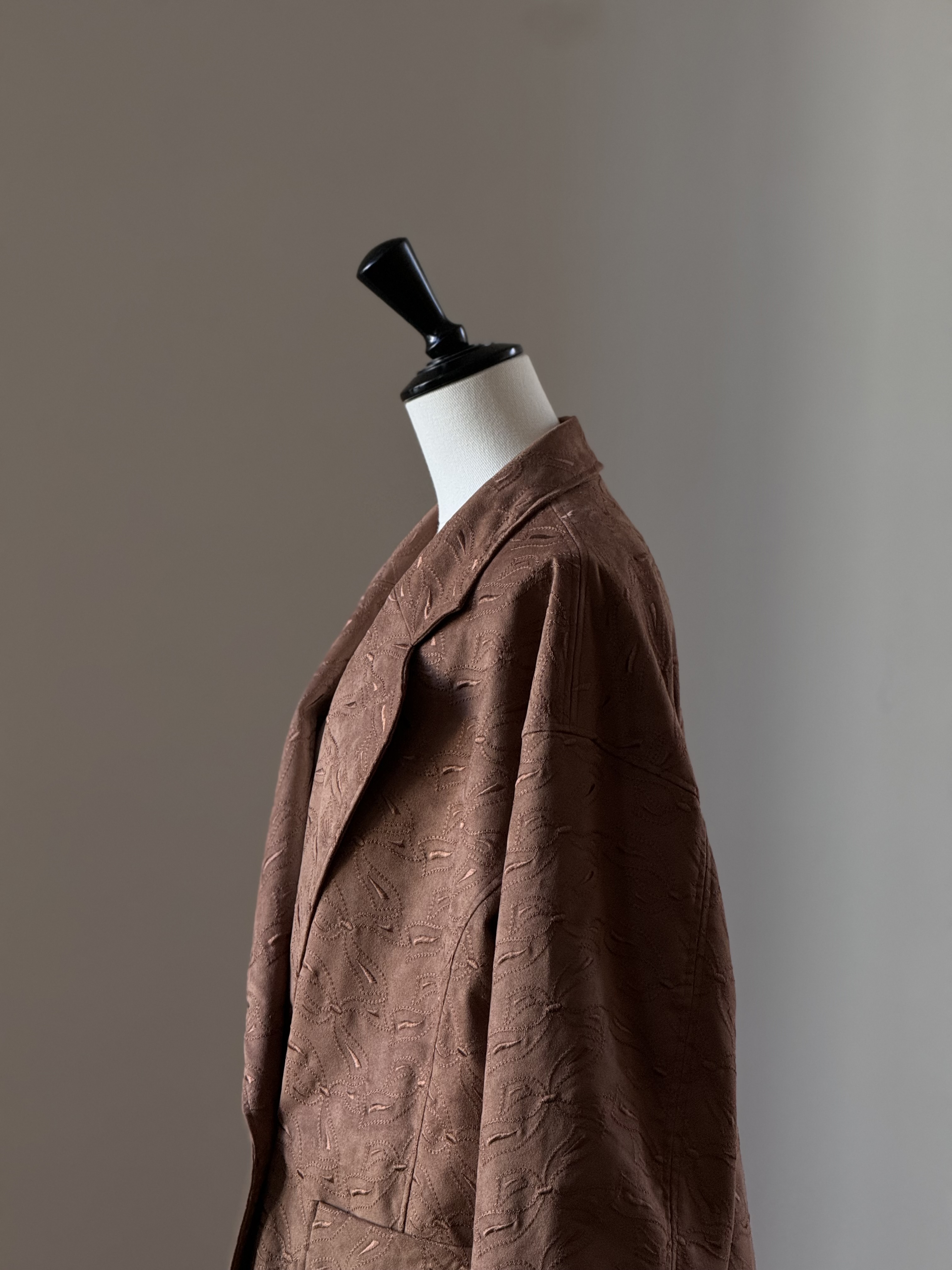 しなやかなスエードに繊細な刺繍を重ねた、ビッグシルエットのダブルジャケット。程よい光沢を持つ刺繍糸が、素材の温かみを引き立てながら装いに華やかさを添えます。ヒップを隠す着丈はパンツからスカートまで自在に合わせやすく、春先や秋口の羽織りとしても万能。結ぶ・つなぐというモチーフを纏い、柔らかさの中に品格を宿した一枚です。