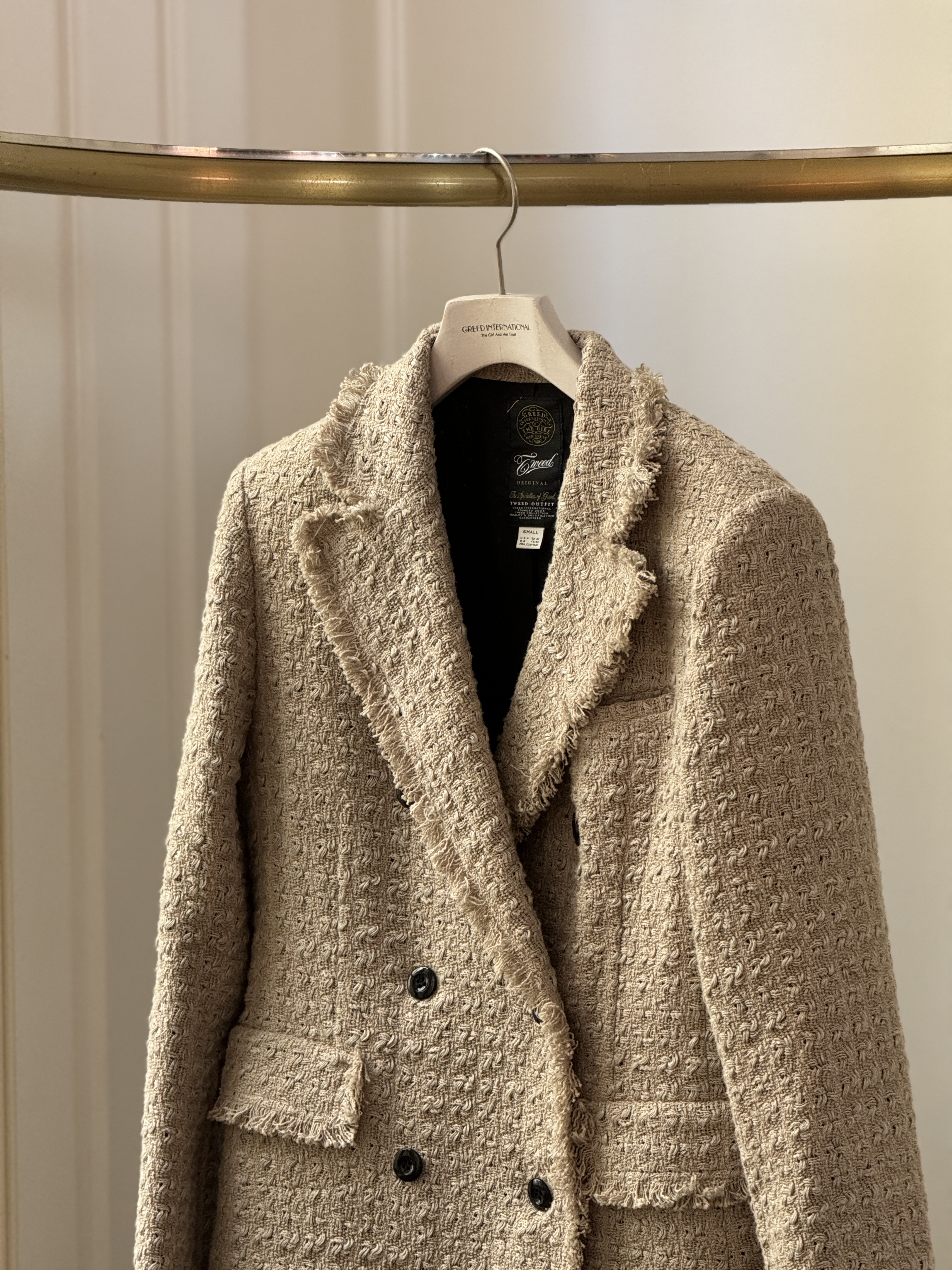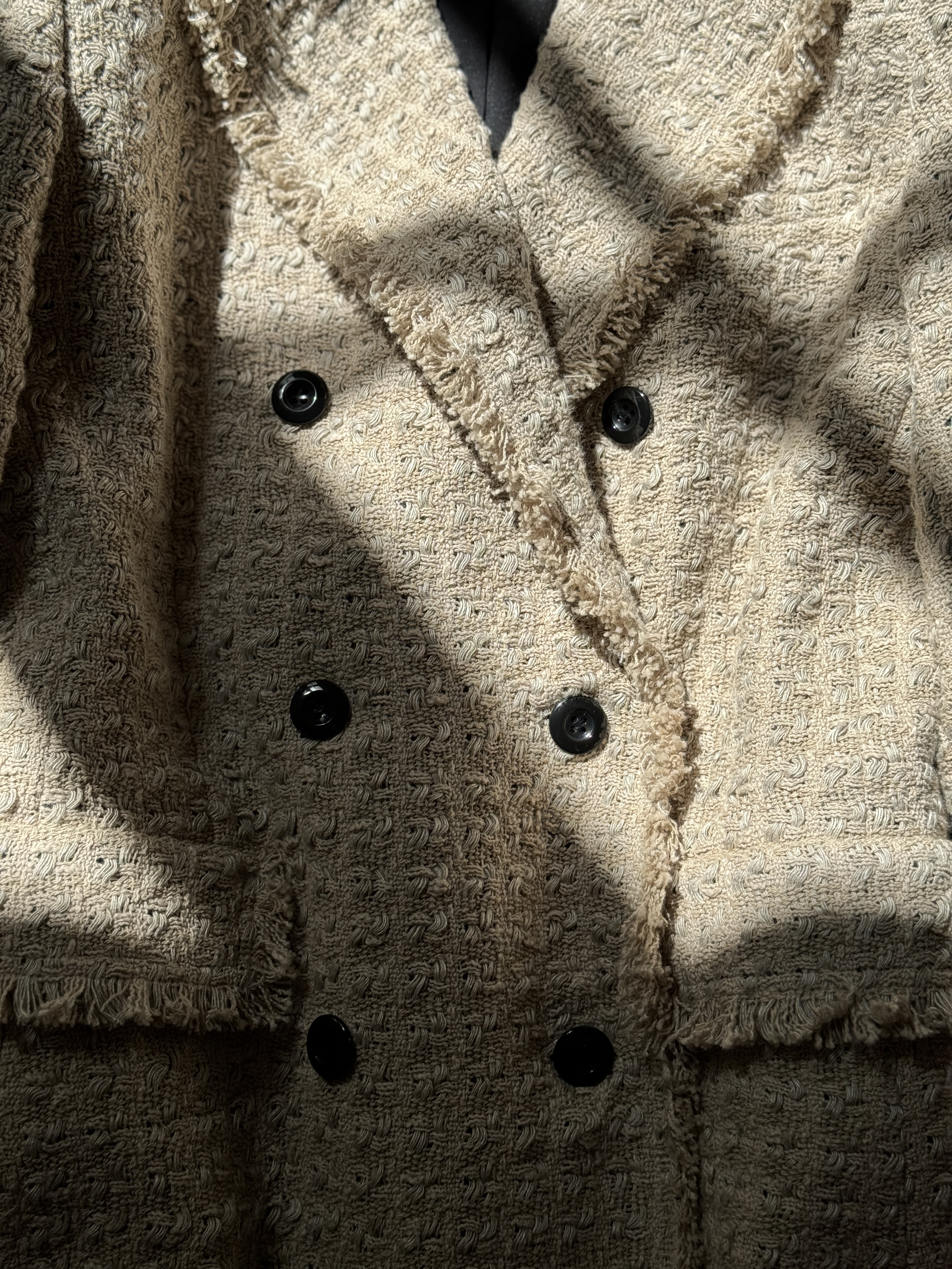 力強いパワーショルダーと、柔らかなツイードの質感が絶妙に調和したジャケット。天然素材ならではの奥行きある表情が、ラフでありながらも高級感のあるスタイリングを叶えます。手織りのようなゆるさを残した風合いは、肩の立体感を際立たせつつもナチュラルなムードを演出。シンプルなインナーに羽織るだけで、秋の日常をクラスアップしてくれる存在感ある一着です。