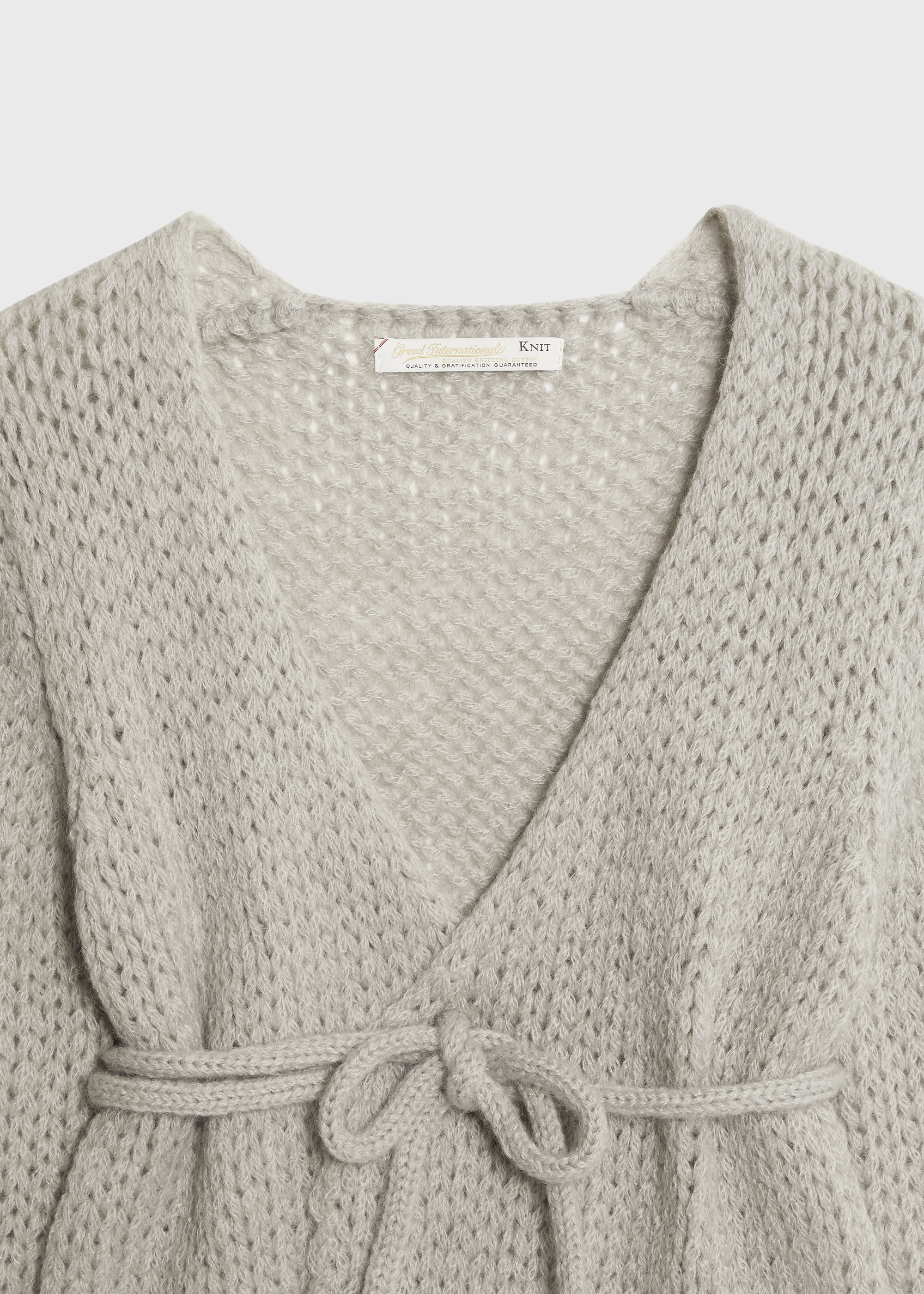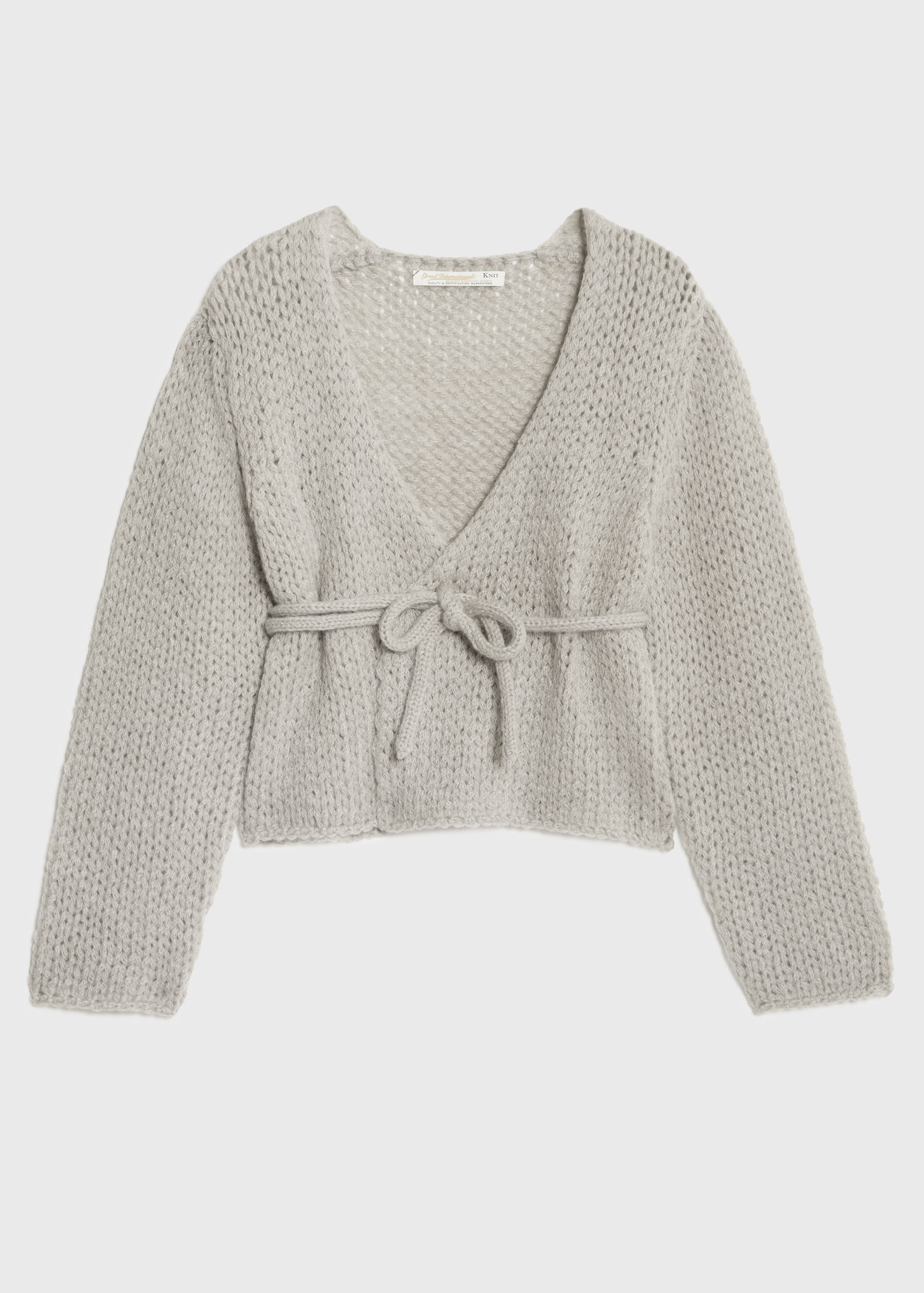 リリーヤーン糸の形状を最大限に生かして、着用時の着心地とシルエットがキレイにでるようバランスを考えたデザインのカシュクールセーターです。ウエスト紐はロープ状に編み存在感を持たせています。様々なインナーと相性良くご着用頂けます。上品な光沢と、毛足の長いソフトな膨らみが特徴の高級なキッドモヘヤを55%使用しております。リリヤンならではの優しい丸みをおびた糸の可愛らしい見た目も魅力の一つです。デザインの仕様上ループの大きさにばらつきが生じる場合がございます。引っ掛かりには十分ご注意下さい。