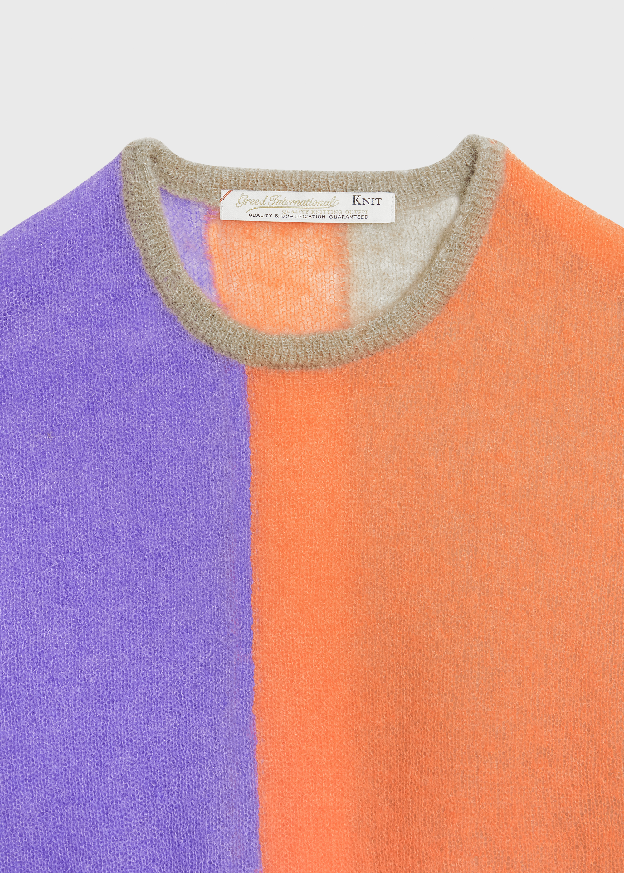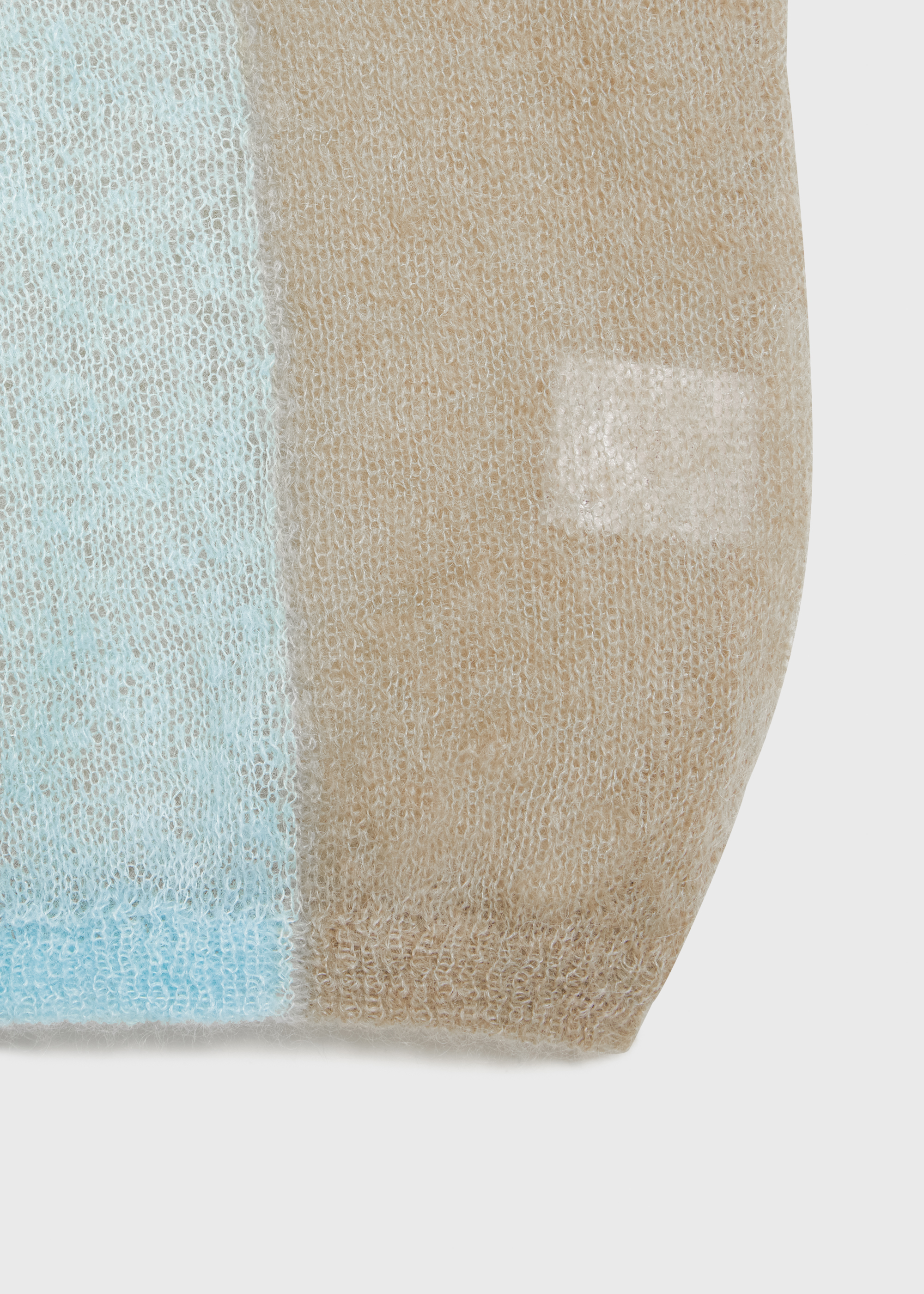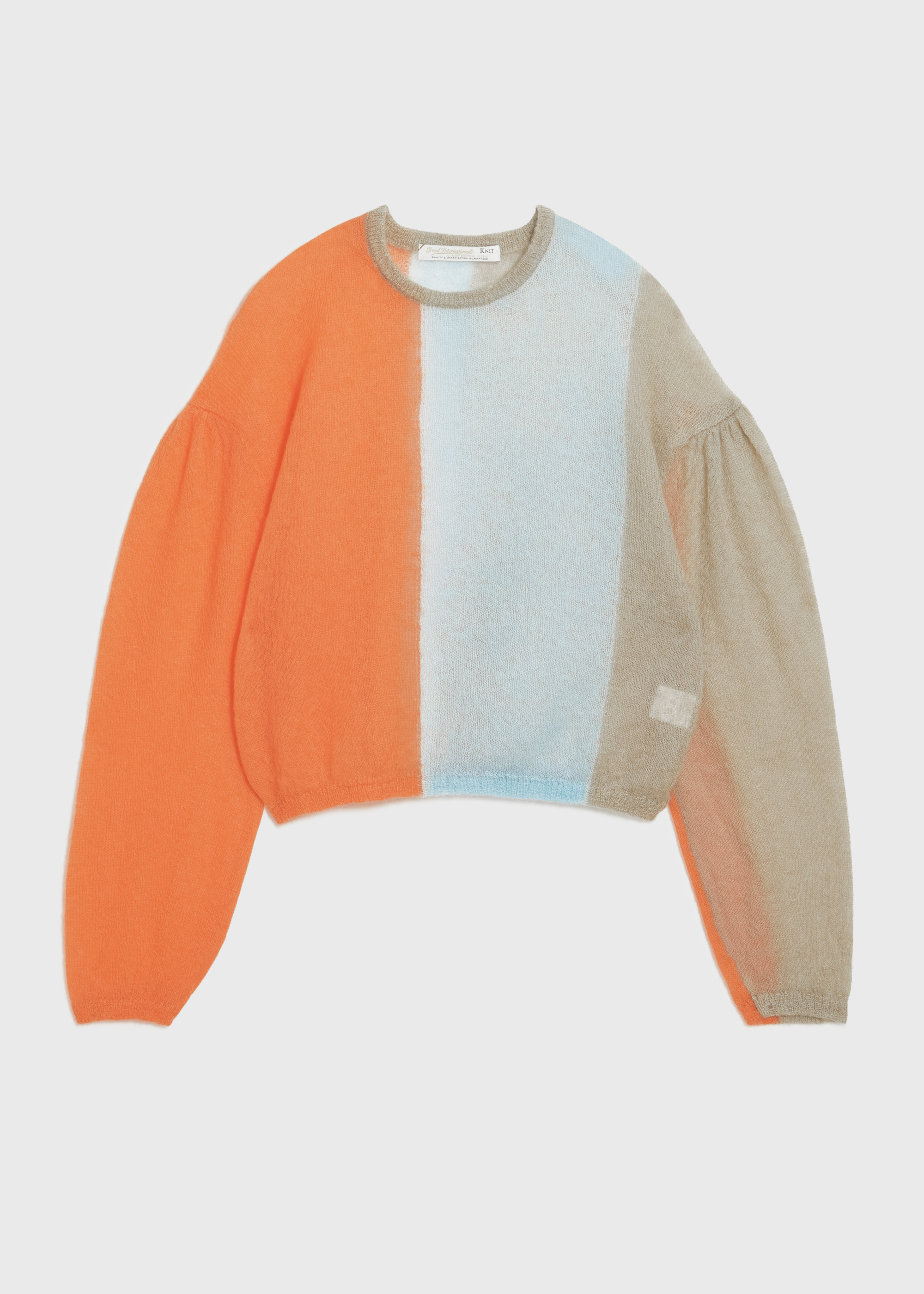 ネック、袖口、裾口のところどころに2種類のダメージ柄編みとストライプのインターシャ編みをデザインしたモヘアニットです。限界まで甘く編むことでモヘアの柔らかさと軽さを出しました。また単糸にすることであえて古着にしか出せないような斜行を表現し大胆ながらも優しい配色のこだわりのニットです。重ね着やジャストウエストのボトムスとも相性抜群のショート丈となっております。高級なキッドモヘアを55%使用し、キッドモヘアの特徴である光沢にヌメリと膨らみも兼ね備えたエアリー感に富んだ優しい着心地のスプリングモヘアです。斜行/穴の開いた編みはデザインです。引っ掛かりには十分ご注意下さい。