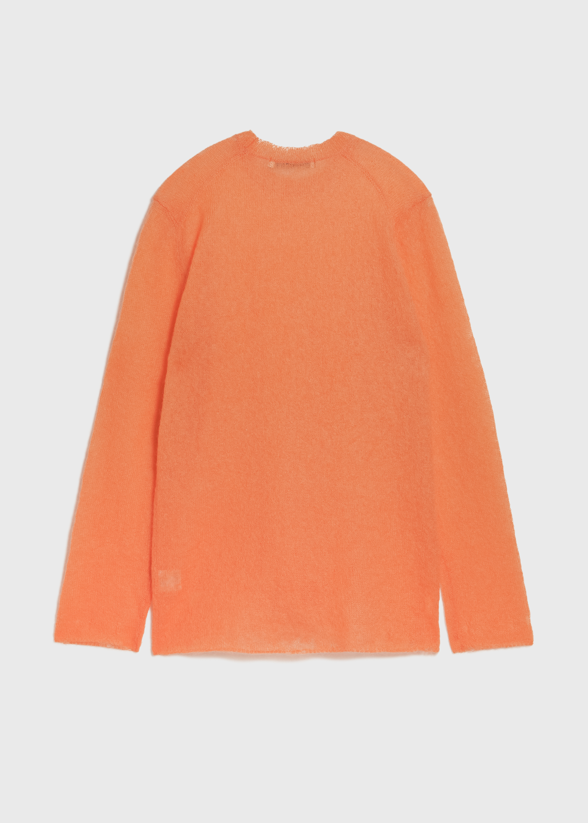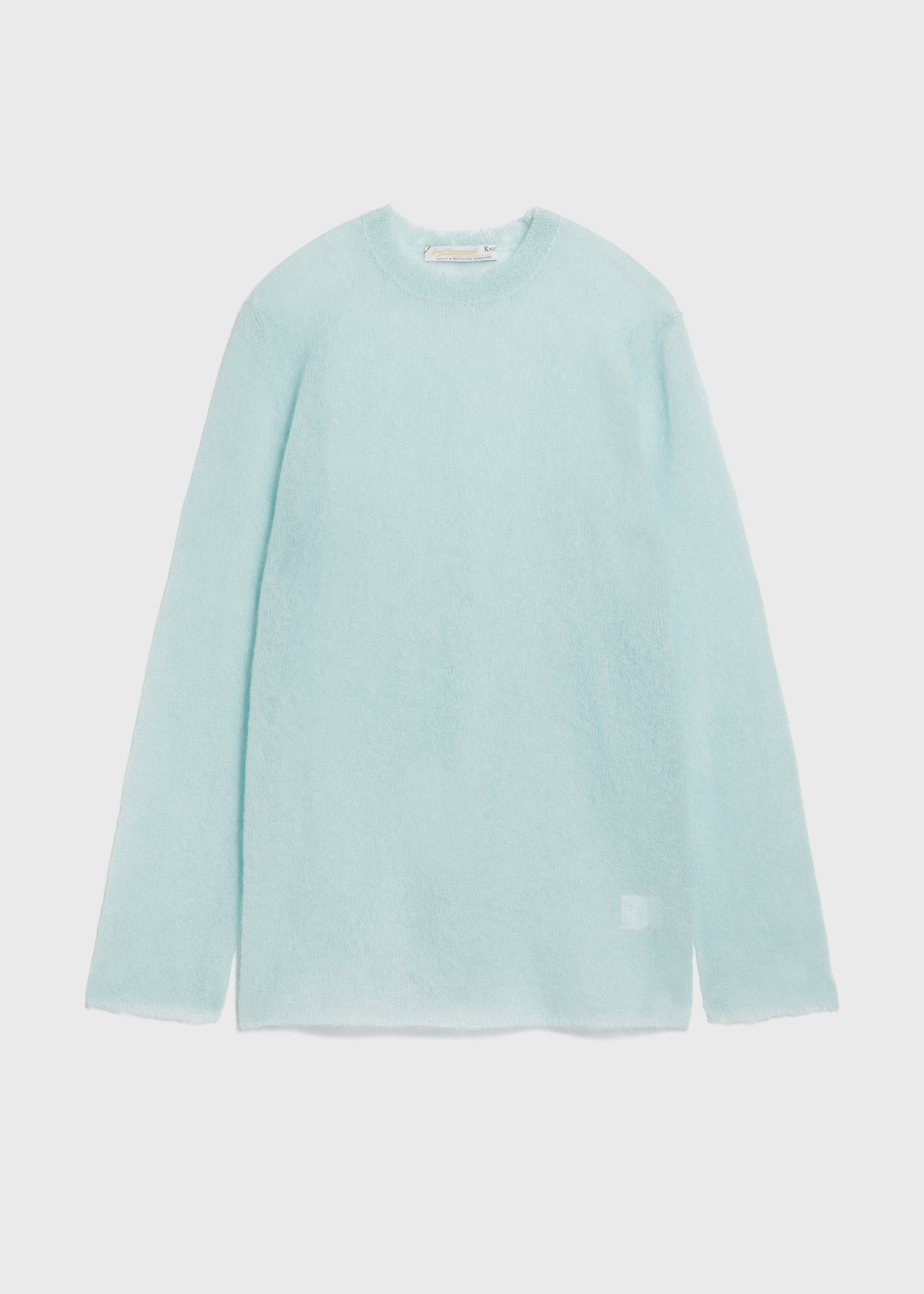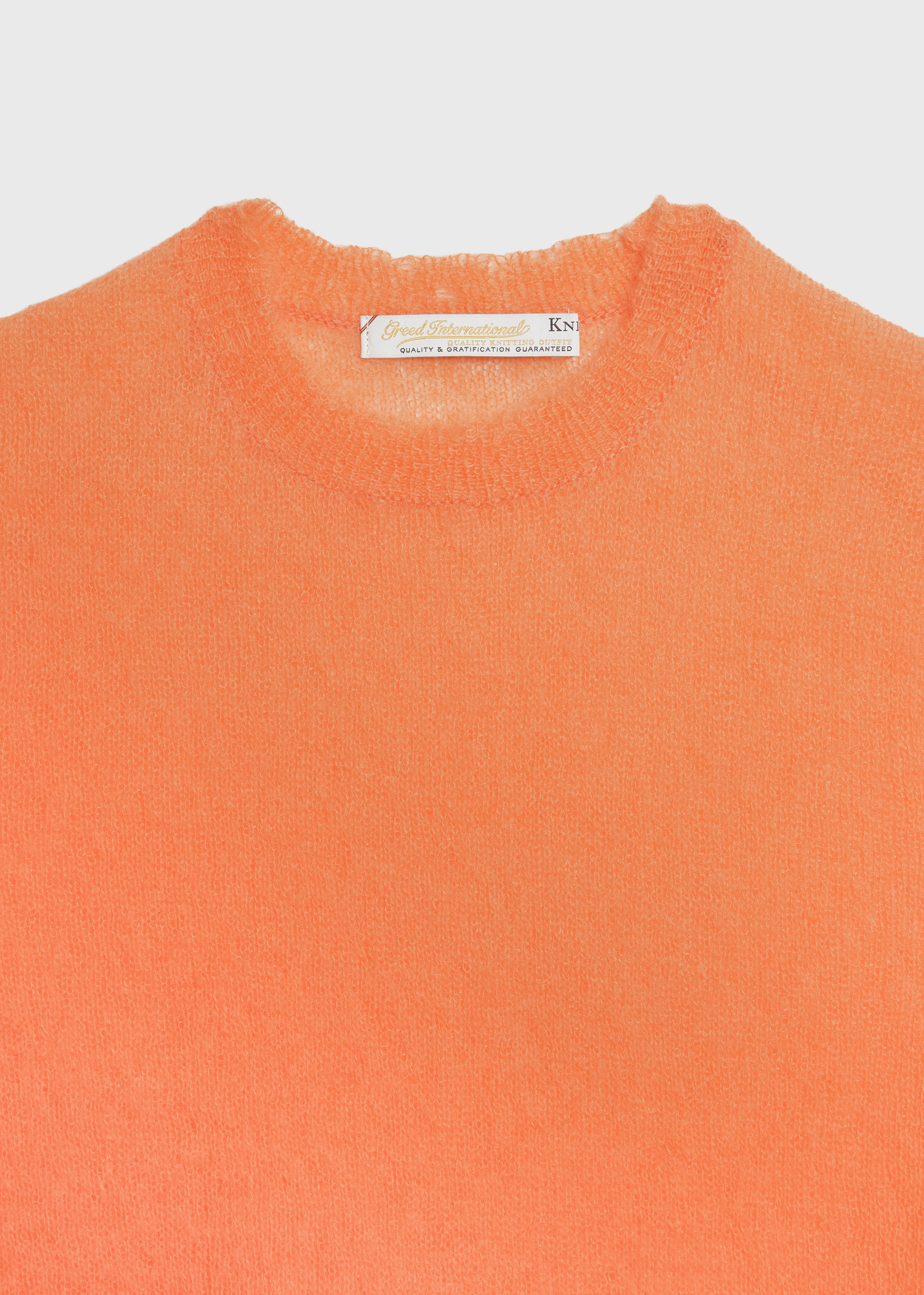 ネック、袖口、裾口のところどころに2種類ダメージ柄の編みをデザインしたモヘアニットです。限界まで甘く編むことでモヘアの柔らかさと軽さを出しました。また単糸にすることであえて古着にしか出せないような斜行を表現したこだわりのニットです。お尻上くらいのロング丈となっております。高級なキッドモヘアを55%使用し、キッドモヘアの特徴である光沢にヌメリと膨らみも兼ね備えたエアリー感に富んだ優しい着心地のスプリングモヘアです。斜行/穴の開いた編みはデザインです。引っ掛かりには十分ご注意下さい。