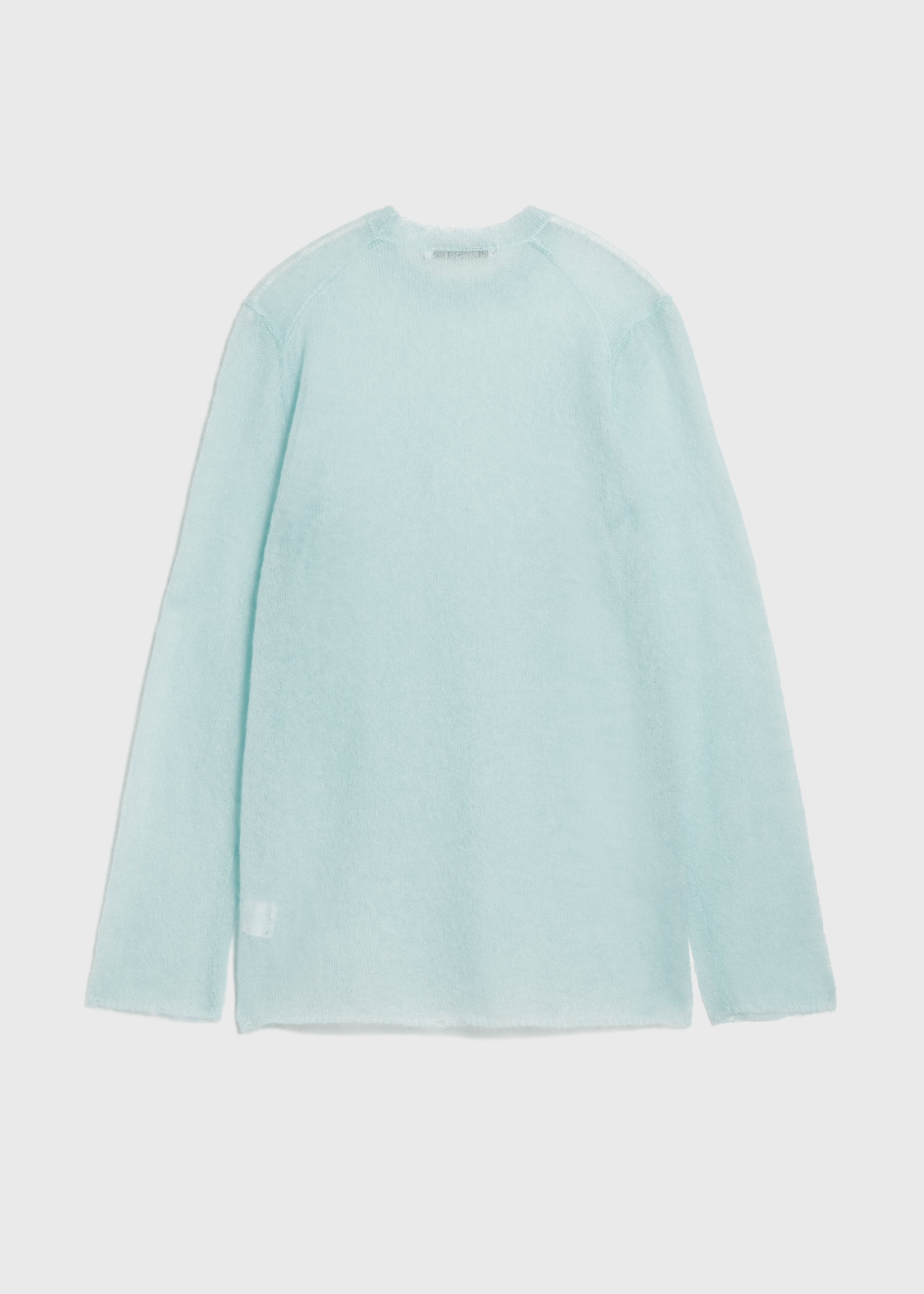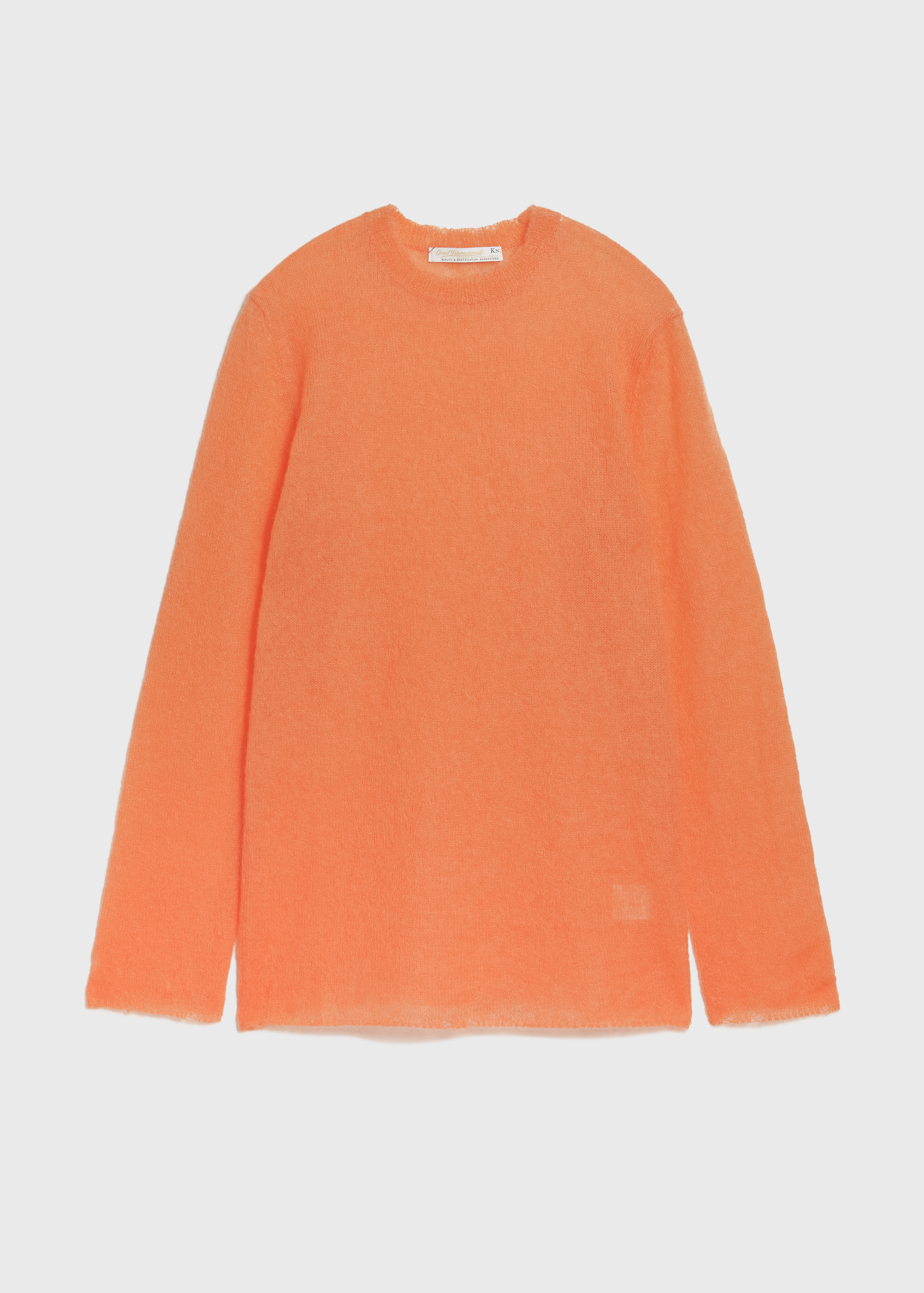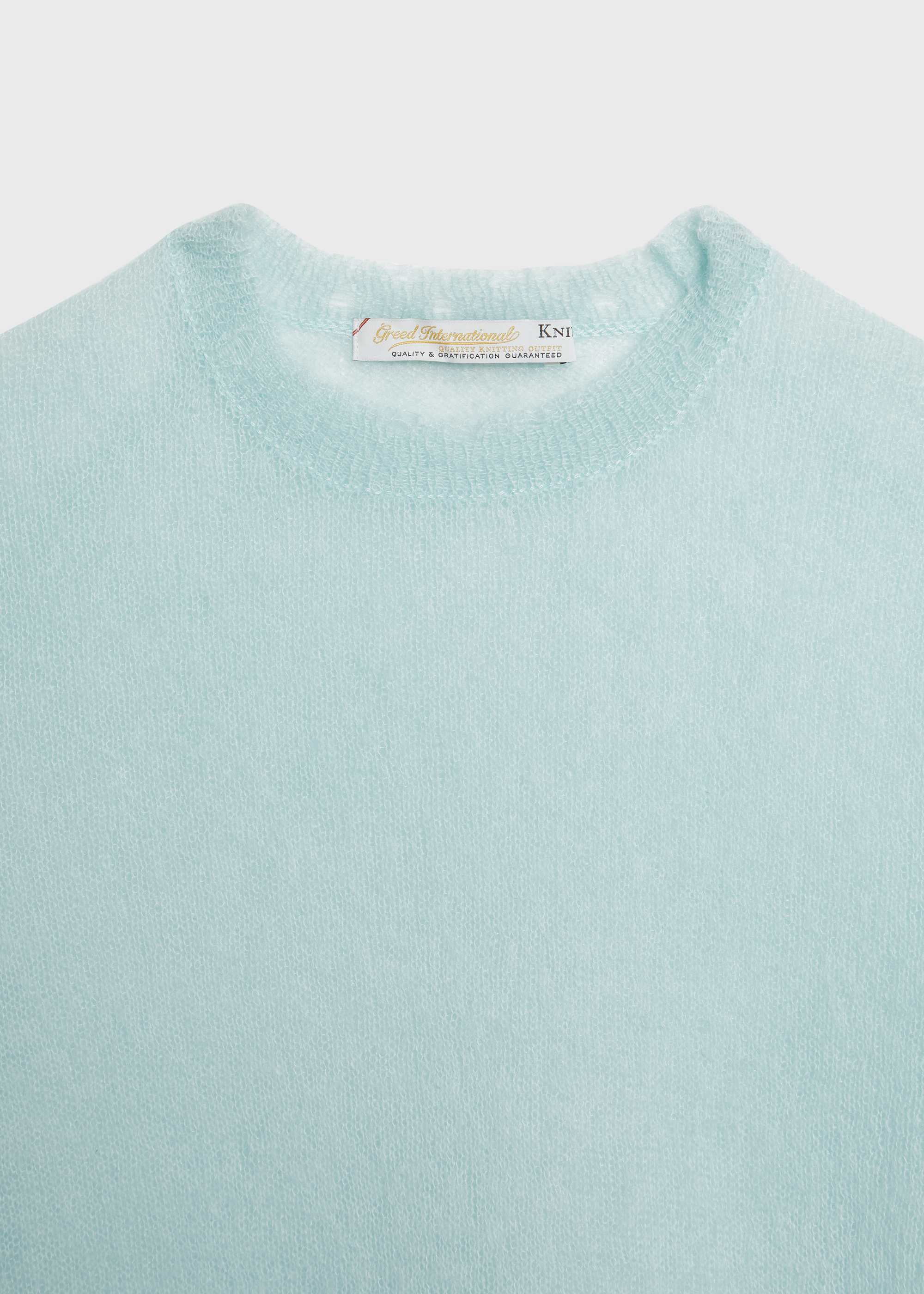 ネック、袖口、裾口のところどころに2種類ダメージ柄の編みをデザインしたモヘアニットです。限界まで甘く編むことでモヘアの柔らかさと軽さを出しました。また単糸にすることであえて古着にしか出せないような斜行を表現したこだわりのニットです。お尻上くらいのロング丈となっております。高級なキッドモヘアを55%使用し、キッドモヘアの特徴である光沢にヌメリと膨らみも兼ね備えたエアリー感に富んだ優しい着心地のスプリングモヘアです。斜行/穴の開いた編みはデザインです。引っ掛かりには十分ご注意下さい。