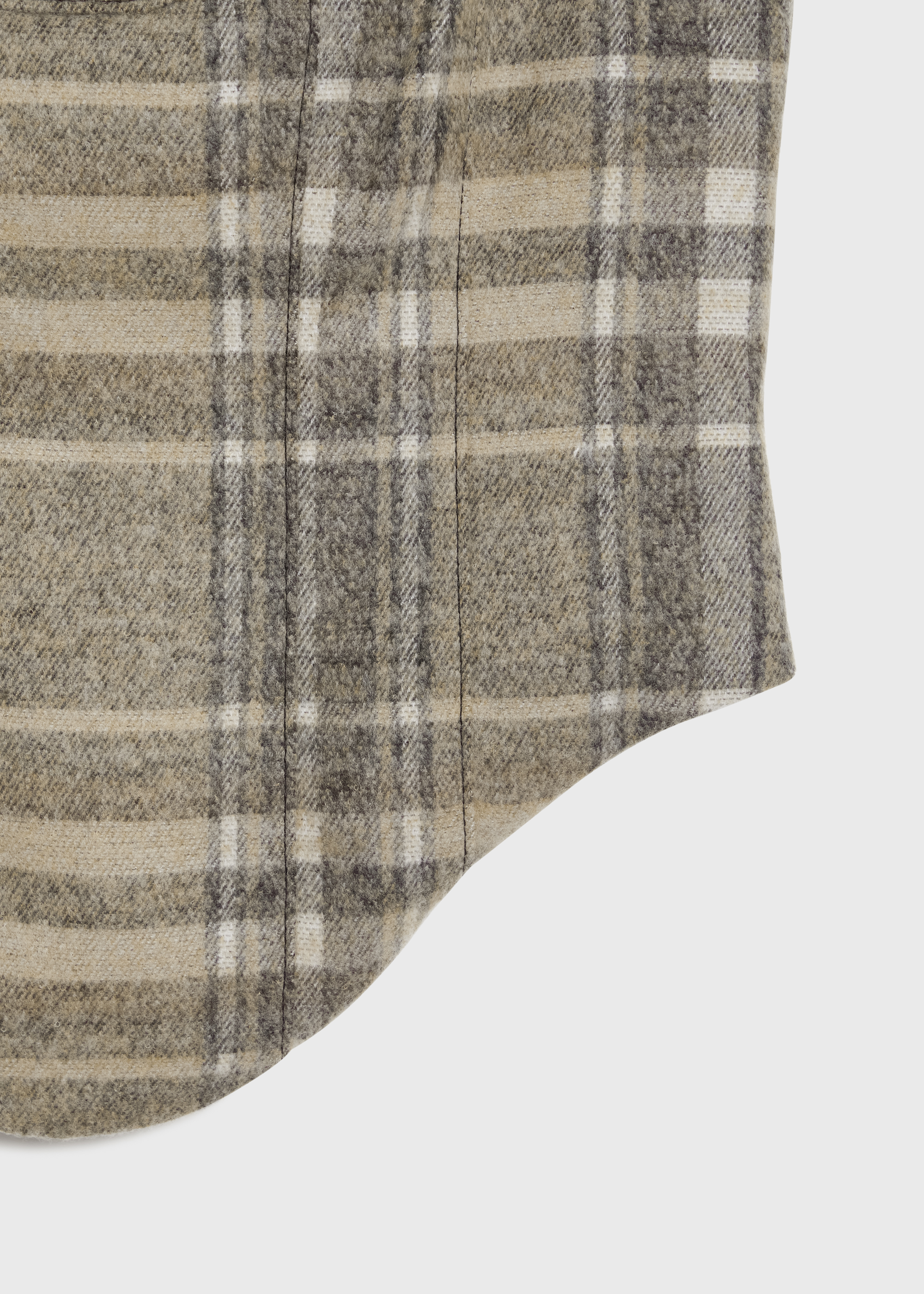 コルセットタイプのショートトップです。インナーにはカットソーから薄手のニットまで、様々なコーディネートが楽しめます。ポリエステルレーヨン糸とウールナイロン糸を使用した綾組織のチェック柄に起毛を施し、柄をぼんやりと浮き上がらせたチェック生地です。とても柔らかく落ち感と温かみも感じられるクラシカルな素材です。