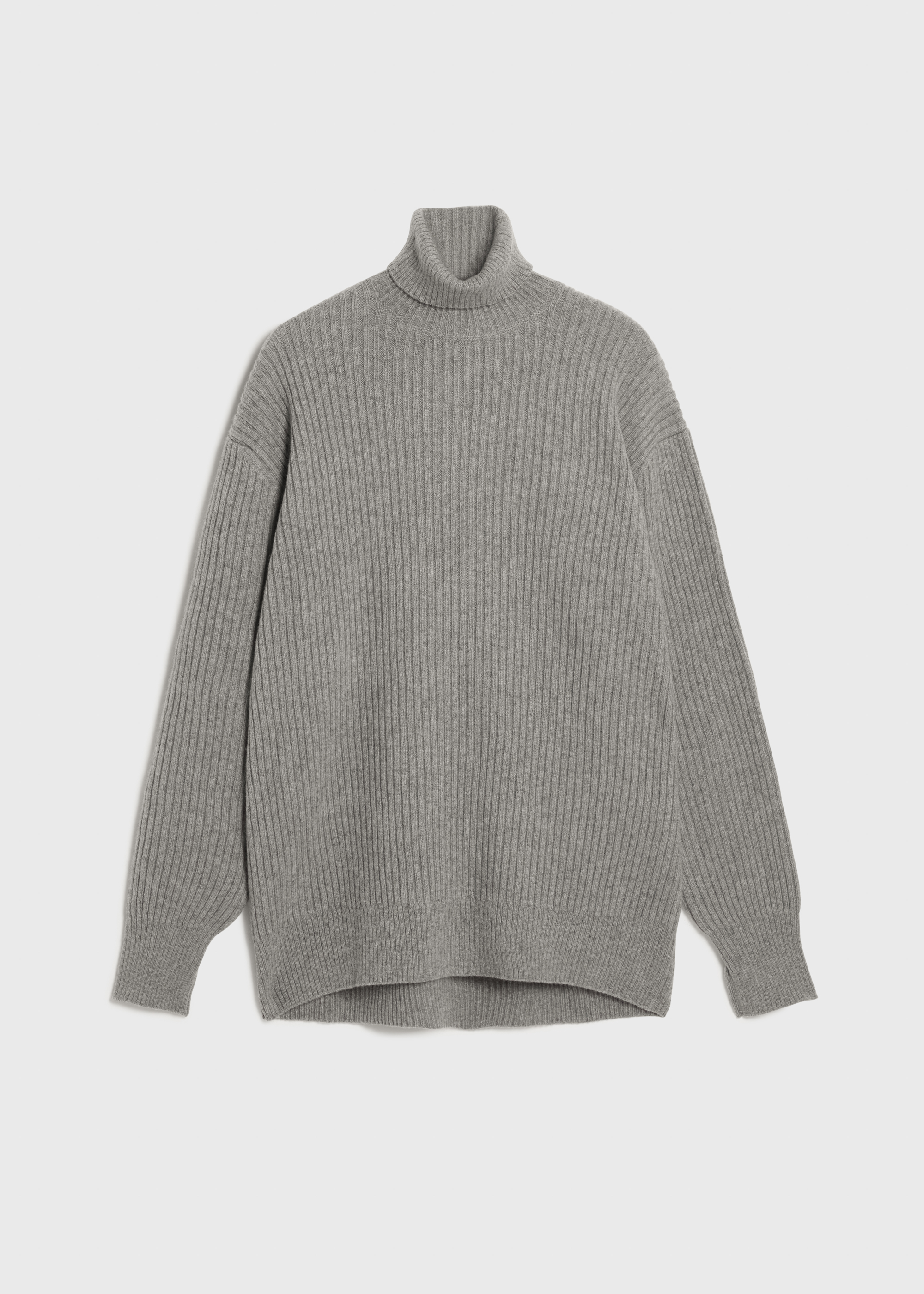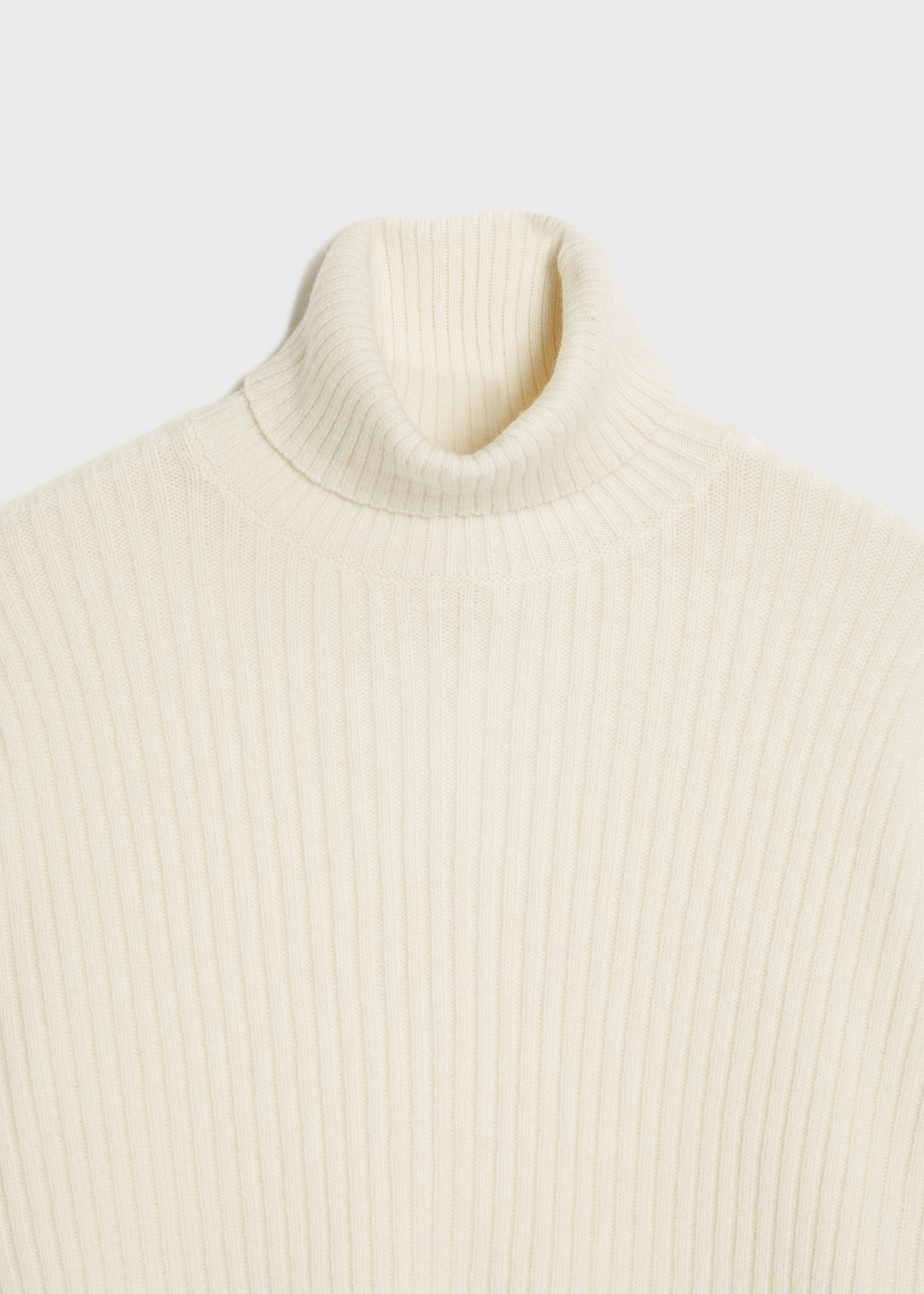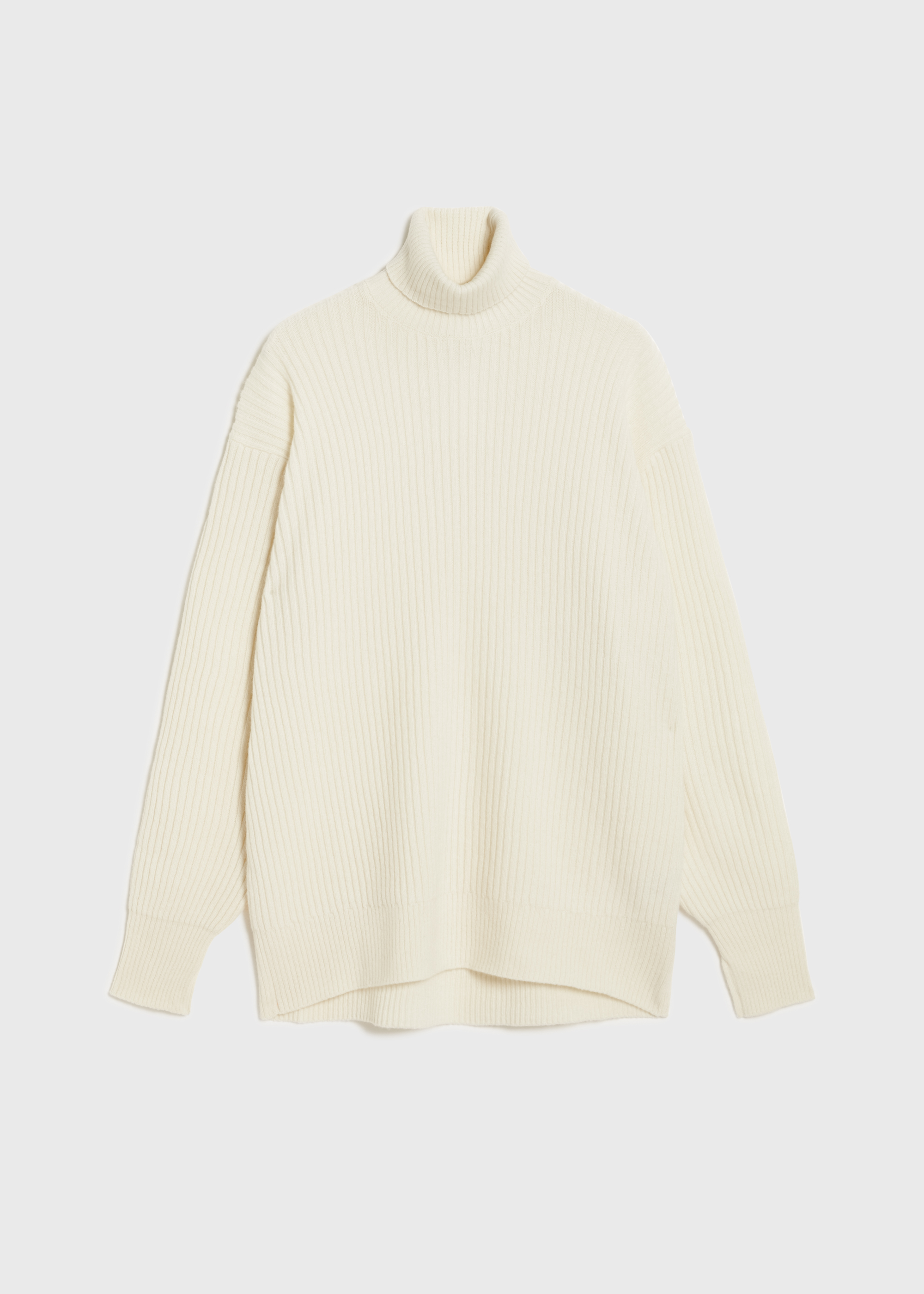 カシミヤとラムの混紡糸を使用したビッグシルエットのハイネックリブニットです。なめらかな肌触りで、ハイネック部分は綺麗に倒れるように中間にマルロンを入れて美しくデザインしています。厳しい環境で飼育されたモンゴル産のホワイトカシミヤはとても細く柔らかい産毛が密集している為、非常に軽く柔らかいのが特徴です。またラムサイドは、ラムウールの中でも特に品質が良いと言われるオーストラリアのジロン地方で産出されたファインラムを厳選して使用おり、保温、保湿性にも優れた繊維の宝石とも呼ばれる最高級の素材です。選りすぐりの拘りのウールを混紡することで、相乗効果が生まれ、カシミヤ特有のヌメリと柔らかさを兼ね備え、保温性・保湿性も優れた素材となっています。