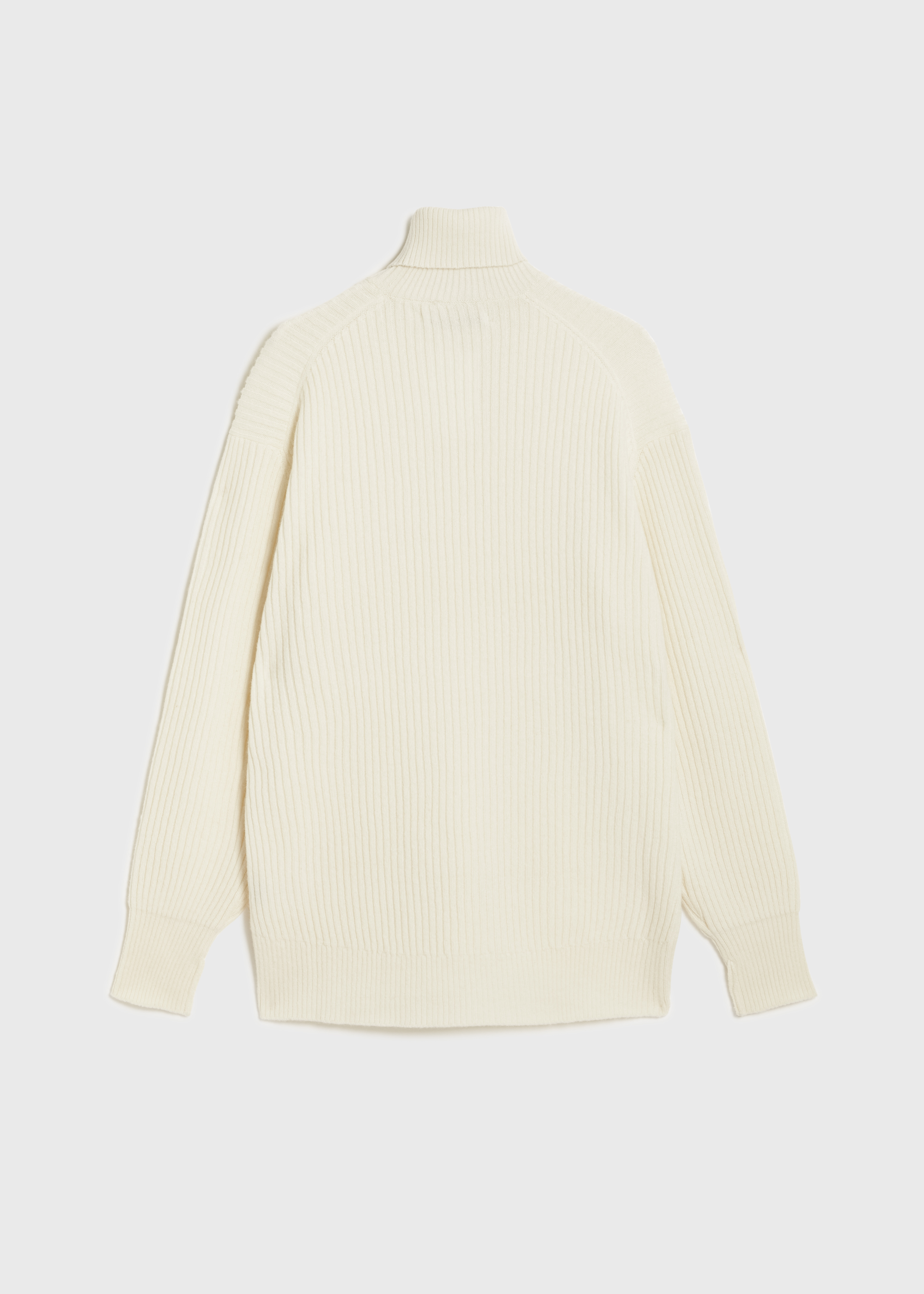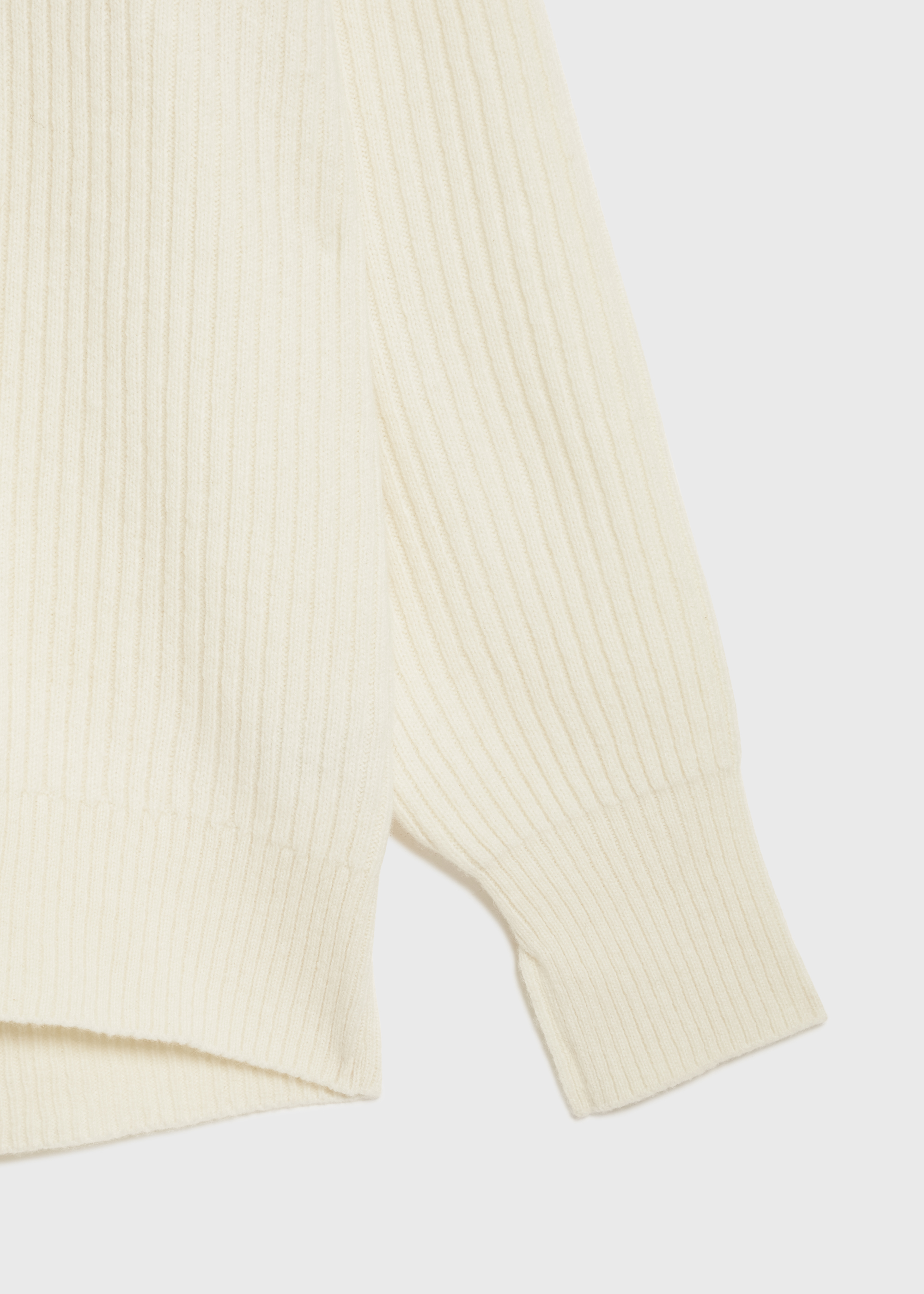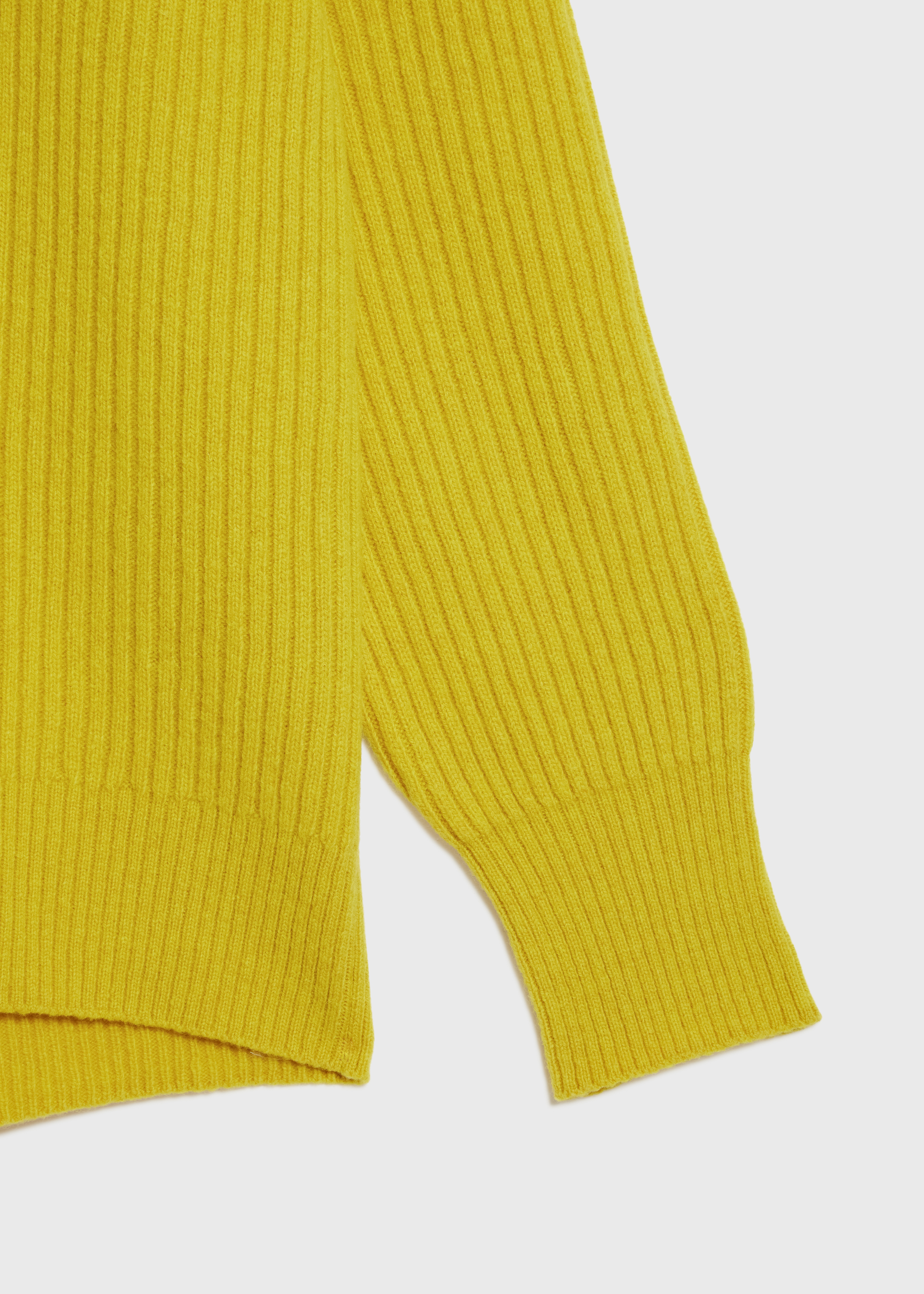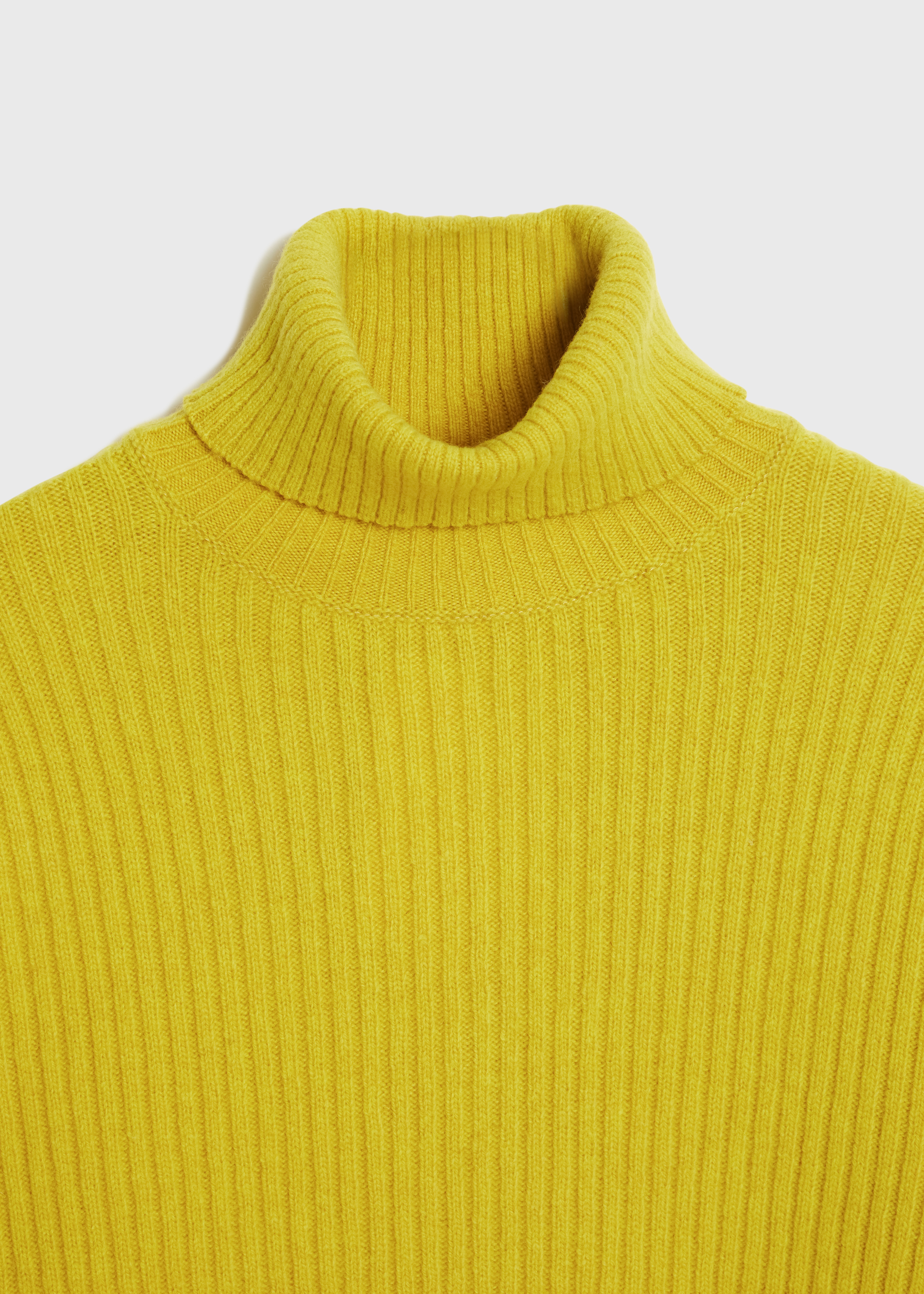 カシミヤとラムの混紡糸を使用したビッグシルエットのハイネックリブニットです。なめらかな肌触りで、ハイネック部分は綺麗に倒れるように中間にマルロンを入れて美しくデザインしています。厳しい環境で飼育されたモンゴル産のホワイトカシミヤはとても細く柔らかい産毛が密集している為、非常に軽く柔らかいのが特徴です。またラムサイドは、ラムウールの中でも特に品質が良いと言われるオーストラリアのジロン地方で産出されたファインラムを厳選して使用おり、保温、保湿性にも優れた繊維の宝石とも呼ばれる最高級の素材です。選りすぐりの拘りのウールを混紡することで、相乗効果が生まれ、カシミヤ特有のヌメリと柔らかさを兼ね備え、保温性・保湿性も優れた素材となっています。