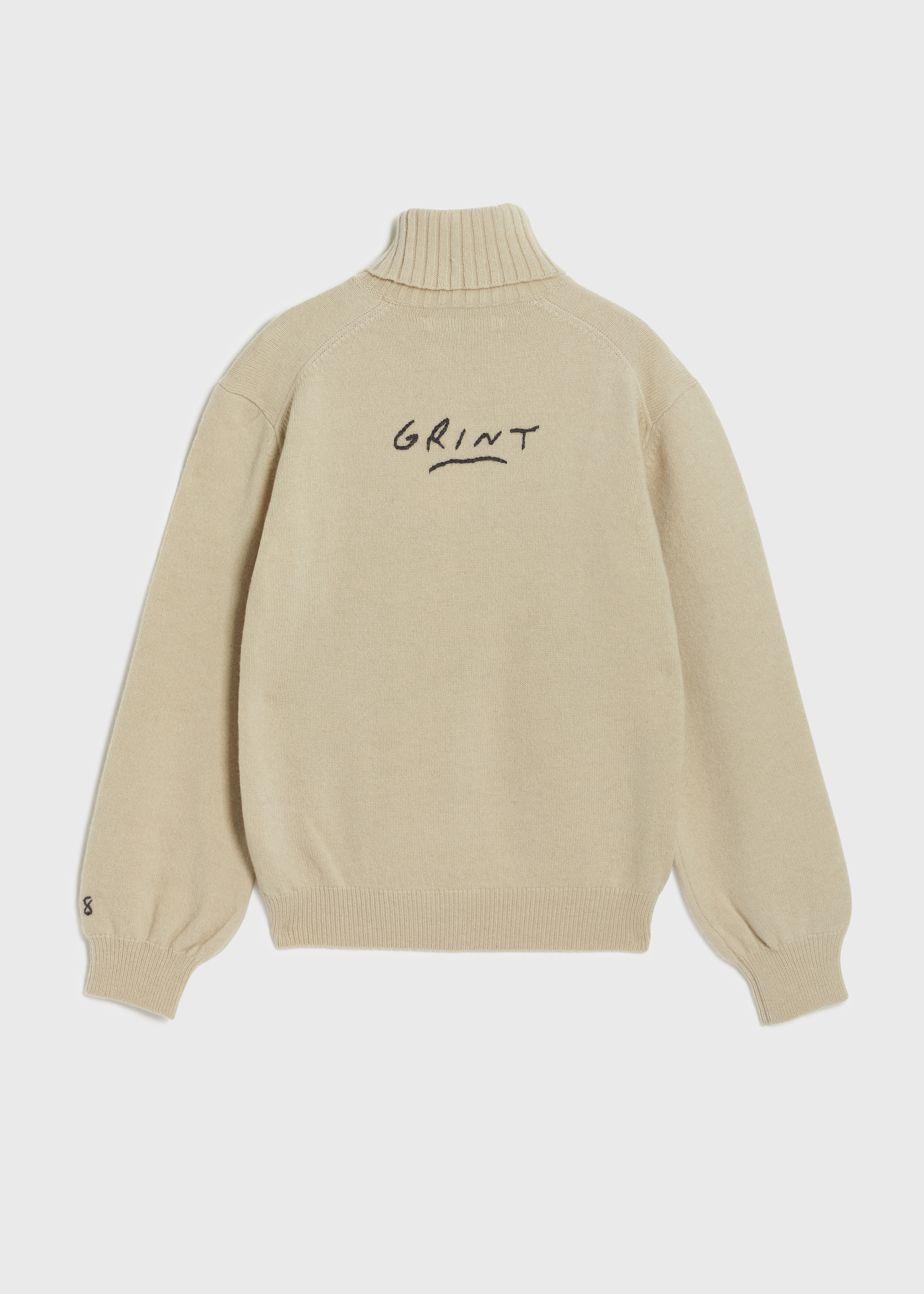 カシミヤとラムとの混紡糸を使用したハイネックニットに、職人のこだわりと日本の技術を詰め込みました。丁寧に手刺繍を施しシリアルナンバーを入れた唯一無二の1点となっております。ベースとなるニットも全て国内で成形したこだわりのニットです。厳しい環境で飼育されたモンゴル産のホワイトカシミヤはとても細く柔らかい産毛が密集している為、非常に軽く柔らかいのが特徴です。またラムサイドは、ラムウールの中でも特に品質が良いと言われるオーストラリアのジロン地方で産出されたファインラムを厳選して使用おり、保温、保湿性にも優れた繊維の宝石とも呼ばれる最高級の素材です。選りすぐりの拘りのウールを混紡することで、相乗効果が生まれ、カシミヤ特有のヌメリと柔らかさを兼ね備え、保温性・保湿性も優れた素材となっています。