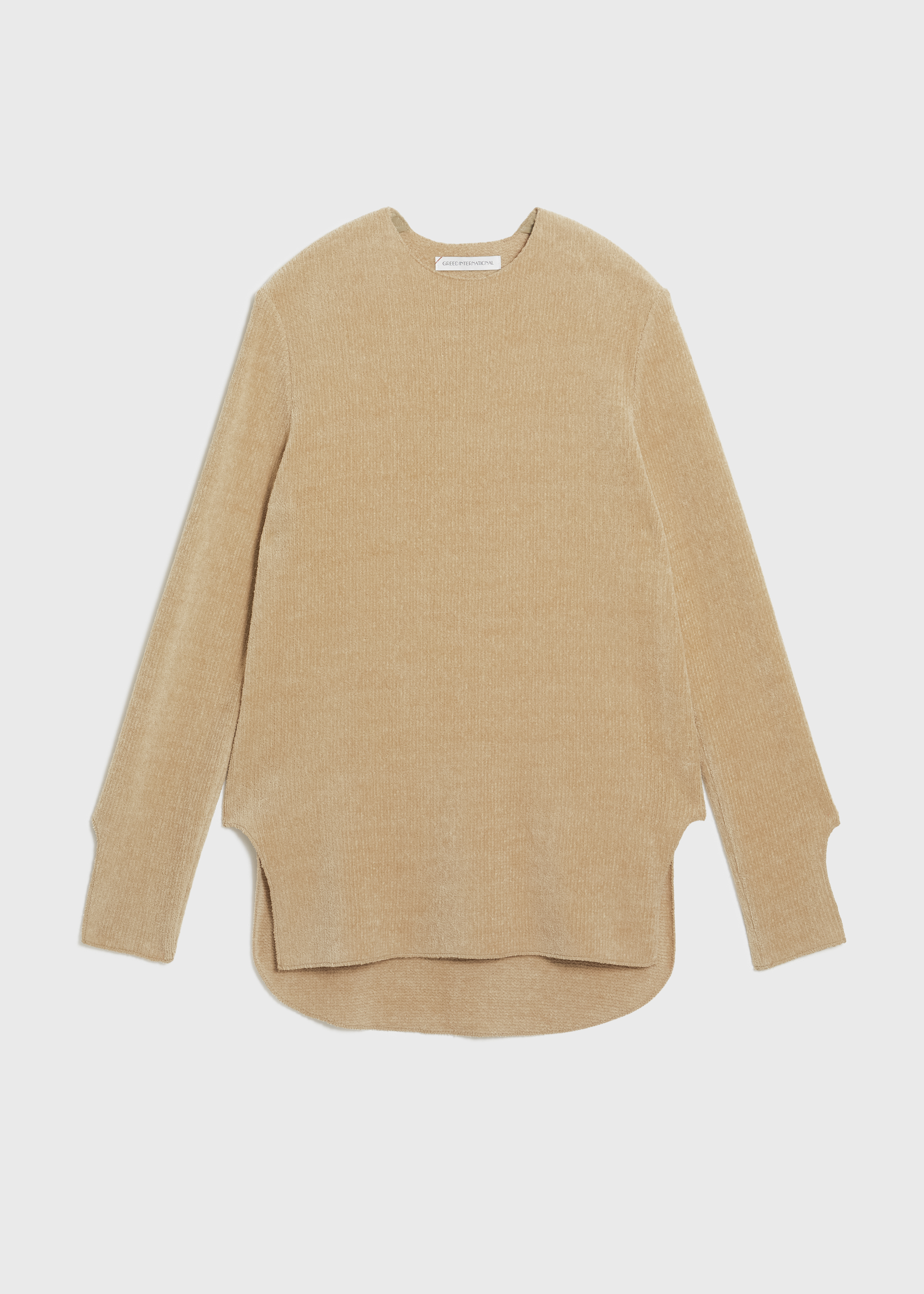 袖口/両サイドをUラインにロック始末でカットしたデザインのシンプルなロングトップです。袖丈はあえて長めのデザインとなっております。後丈を長くデザインしバランスよくお作りしております。襟ぐり/袖口/裾口はロック始末です。モール糸を編み上げる事で出来る色の濃淡が特徴で肌触り良いモール独特のあたたかさが感じられる極上の着心地に仕上げております。モール糸をカットソーに使用する事でニットでは表現できない表情感や風合いを可能にしたオリジナル素材です。
