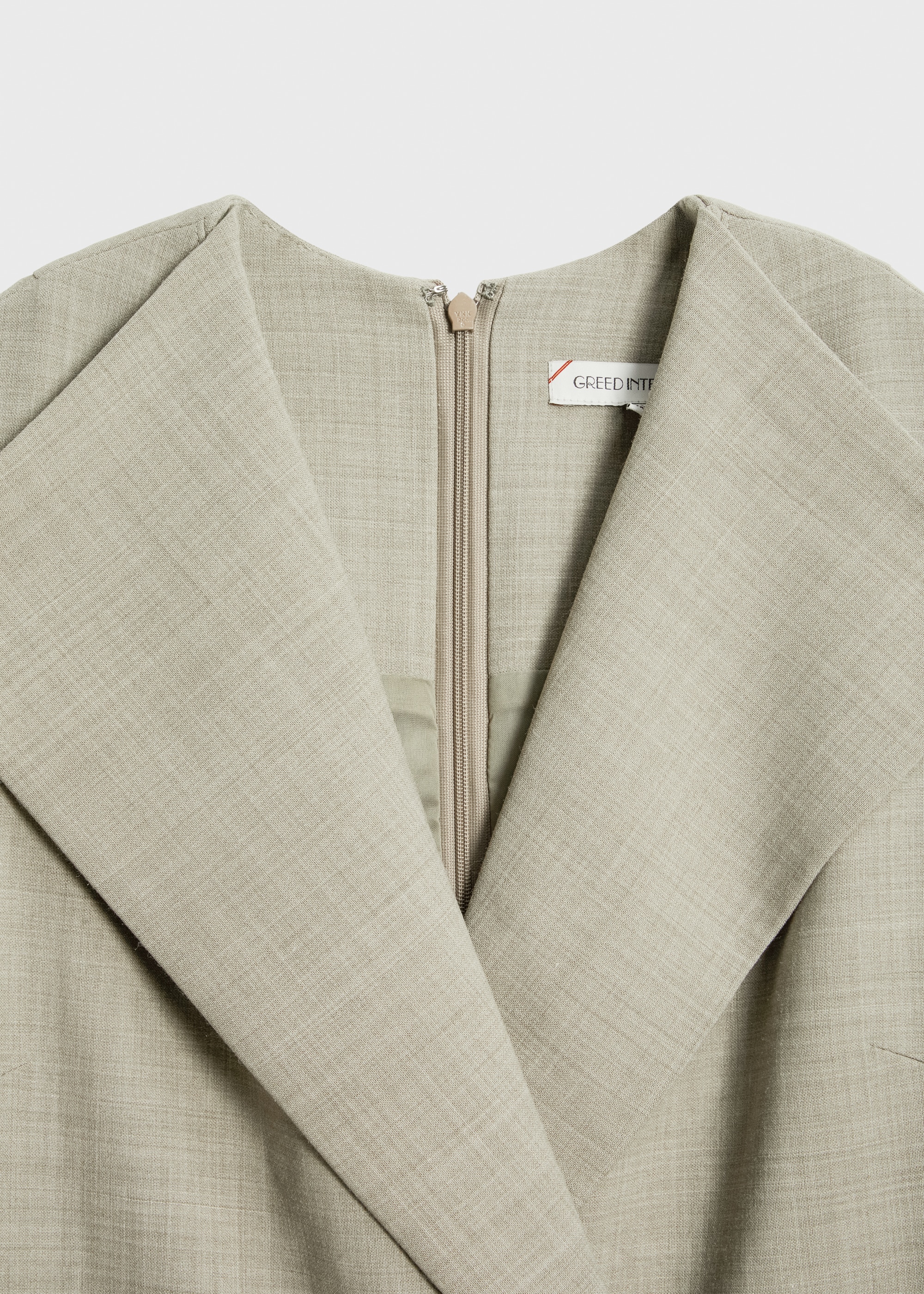 フロントはラペルカラーのような立体的な襟元で、モード感と女性らしさを両立。ウエストには共布ベルトを配し、ブラウジングの調整で表情に変化をつけられるデザインです。背面はシンプルに仕上げ、無駄のない直線的なフォルムが都会的な印象を与えます。