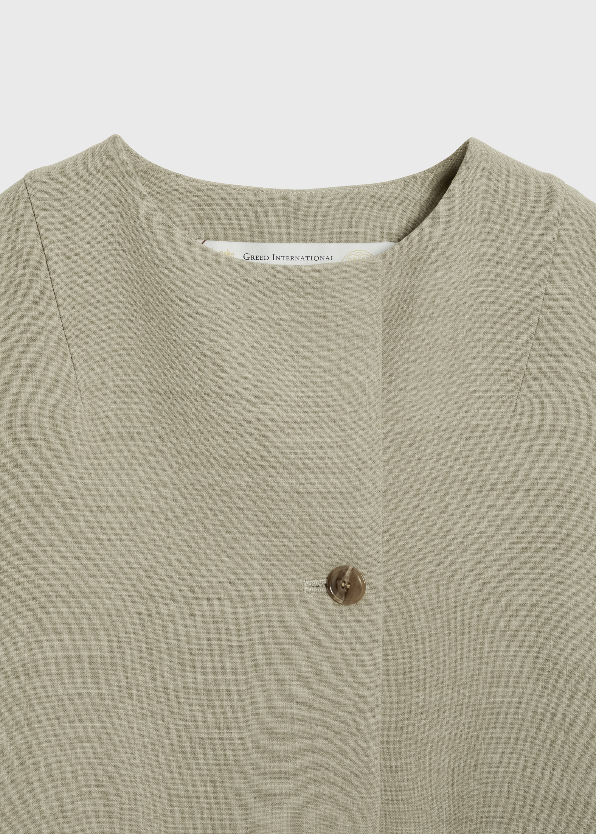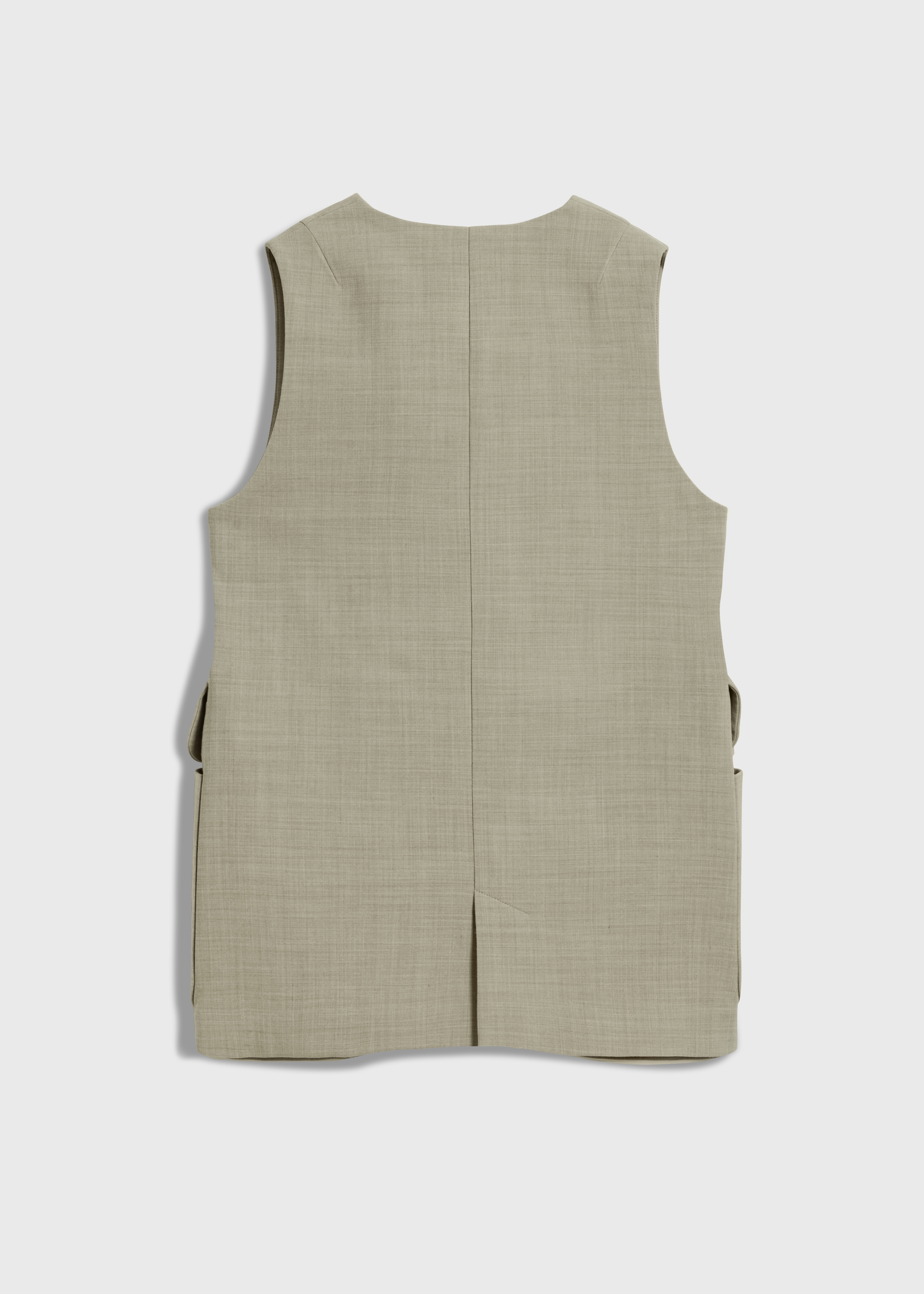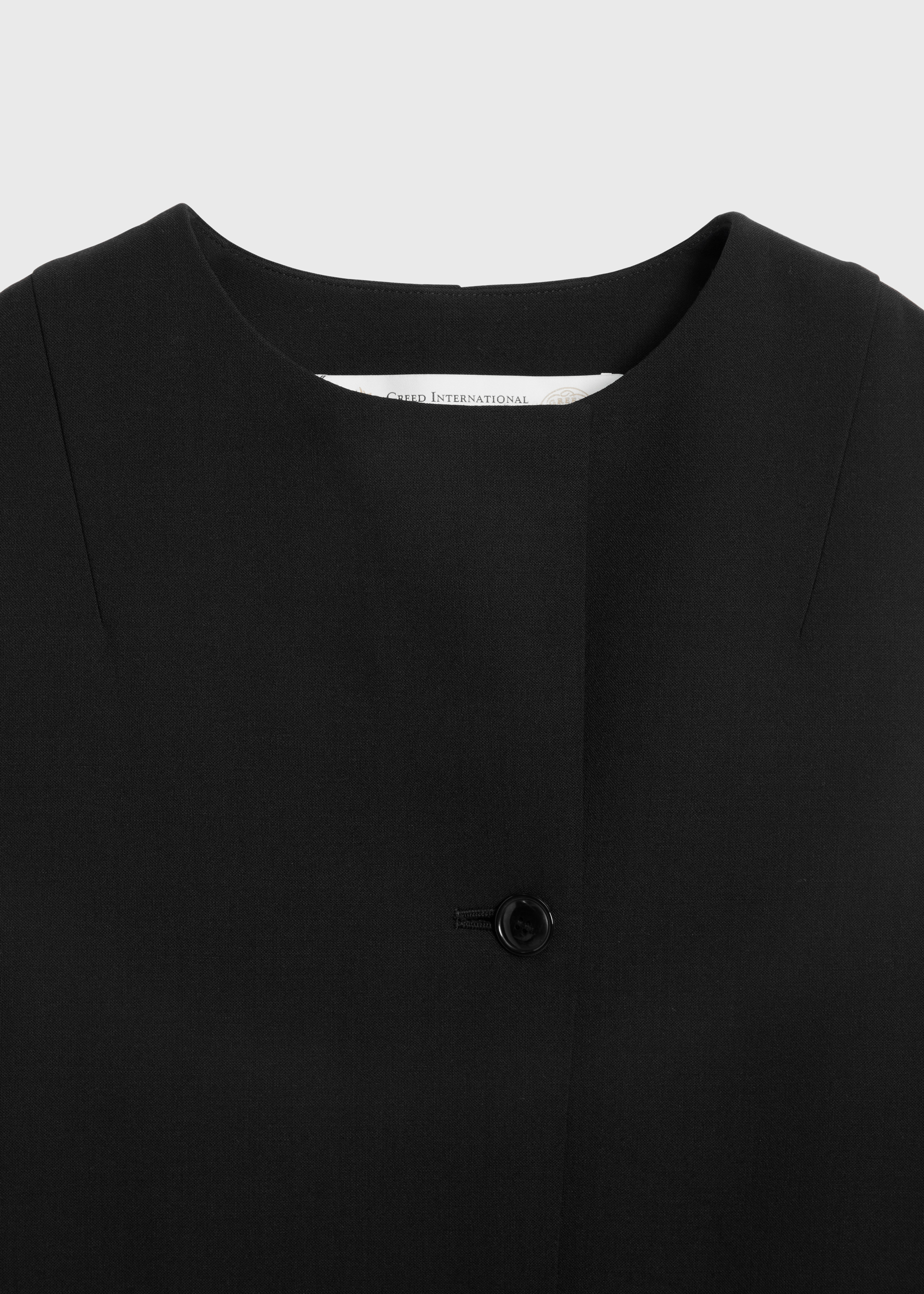 構築的なシルエットと実用性を兼ね備えた、モダンなノースリーブベスト。S/80 サイロTW 2way二重織素材の持つしなやかなハリとストレッチ性を活かし、きちんと感と快適な着心地を両立した一着です。