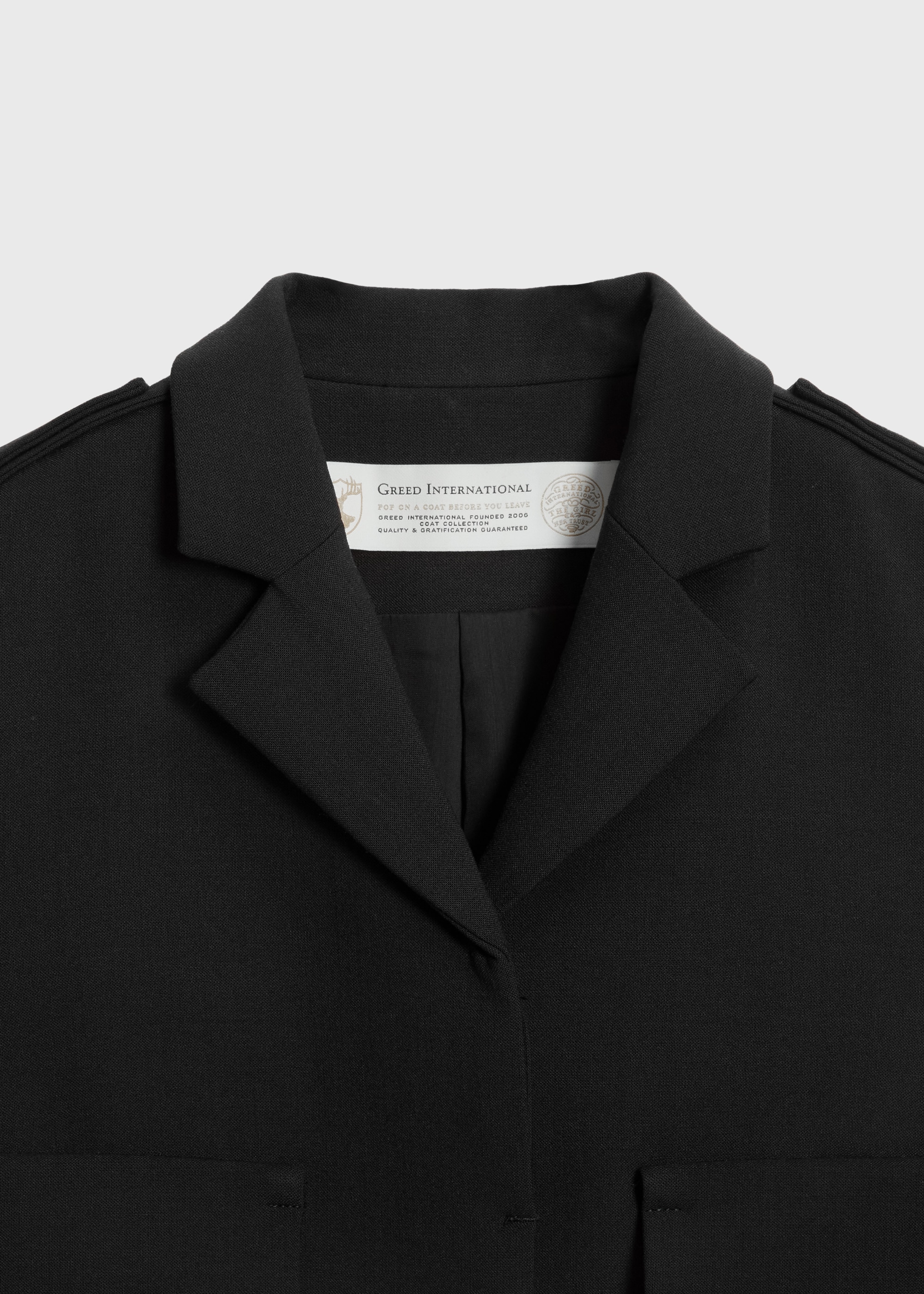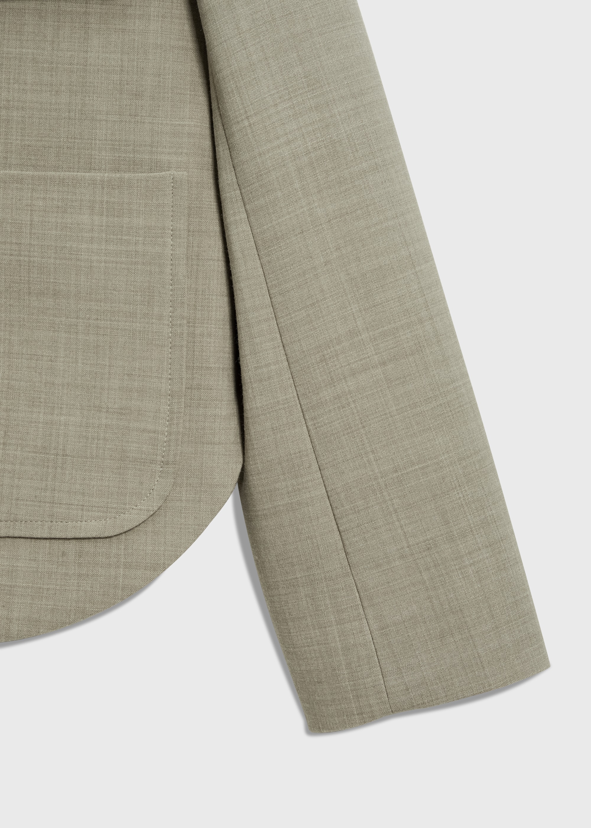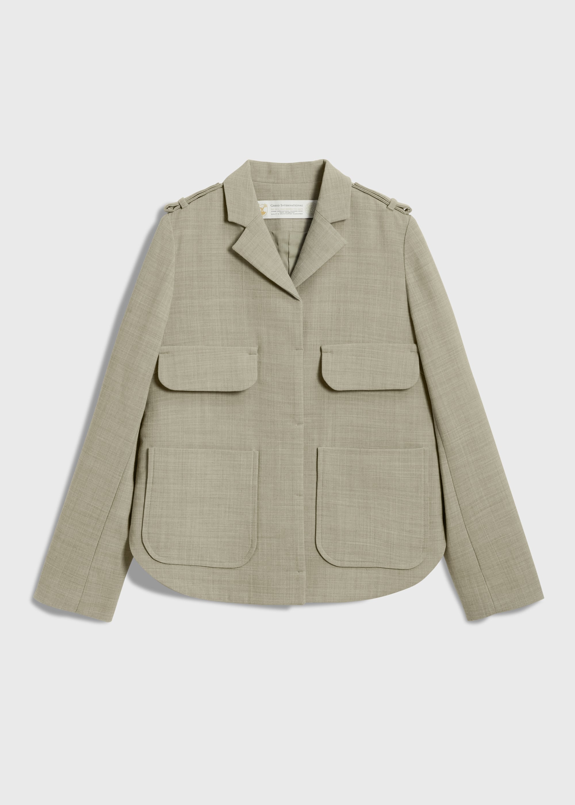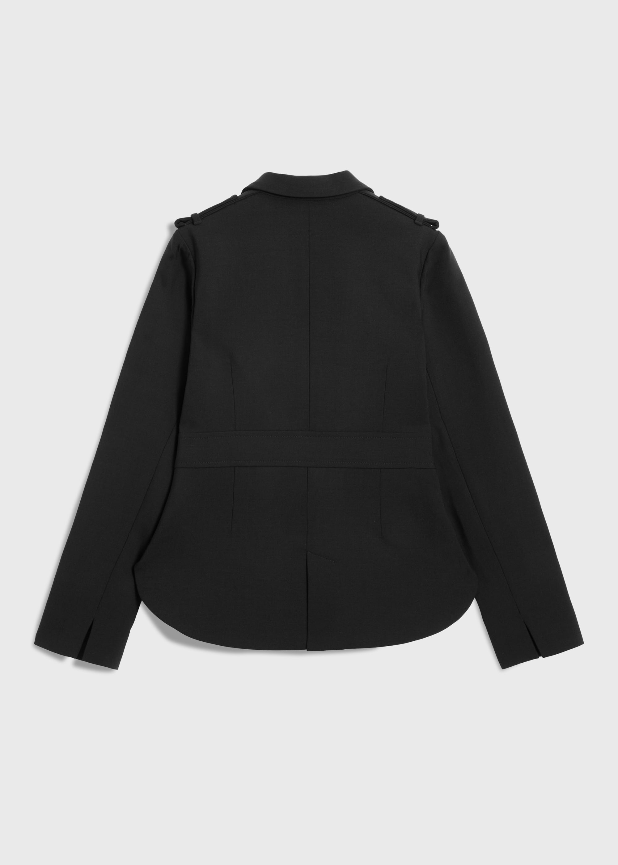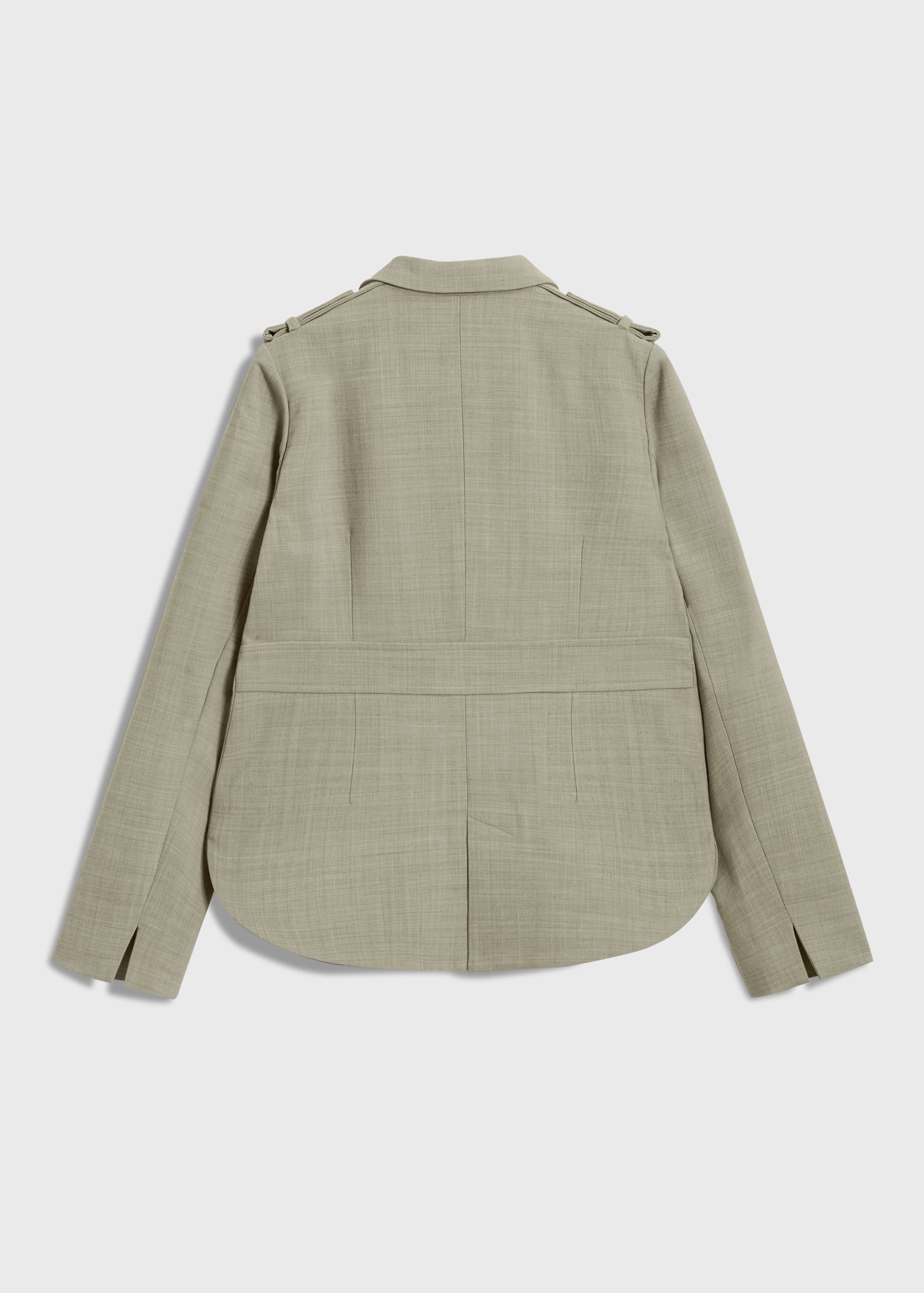 肩にはエポーレット、フロントには大ぶりのパッチ&フラップポケットを配し、存在感のあるバランスに。二重織の構築性を活かした立体的なフォルムが、体のラインを拾わず、軽やかな着心地と品のあるシルエットを両立します。