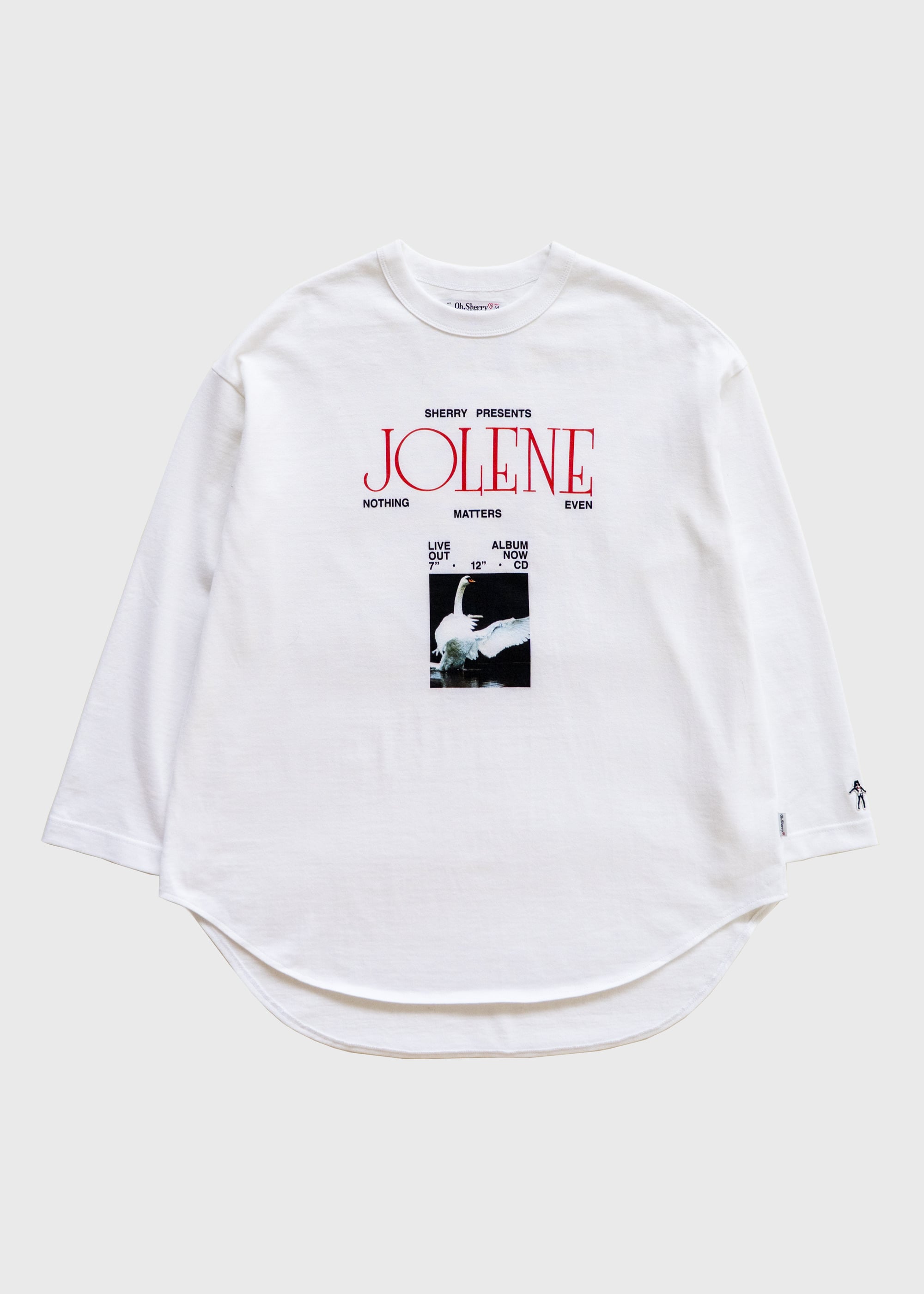胸元には「SHERRY PRESENTS / JOLENE」のタイポグラフィと、静かな余韻を感じさせるスワンのイメージをレイアウト。BODYは、ややドロップショルダーで仕上げたビッグシルエットのロングスリーブTシャツです。身幅にゆとりを持たせたボクシーなシルエットは、体のラインを拾いすぎず、一枚で着てもスタイリングが完成するバランスです。
